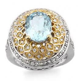 Diamond: 78 Round cut @ 1.05 ctw Clarity: SI-I Color: H-K Gemstone: Natural Aquamarine Gemstone color: AquaGemstone quality: Good-to-Very Good Gemstone Cut & Weight: 1 Oval cut @ 3.0 ctw Metal Purity & Color : 14K Gold-Multi tone Gold weight: 10.7 grams Ring size (US): 7.25Dimension: Approx. 3/4" x 3/16"