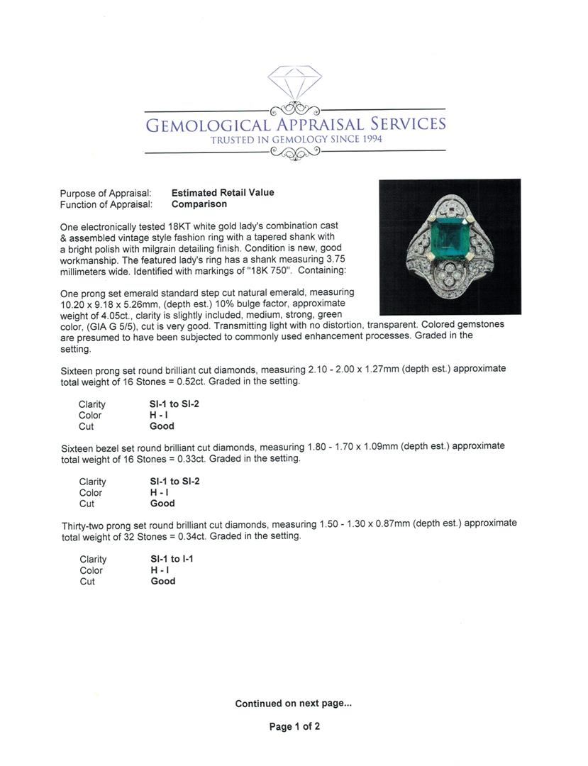 One electronically tested 18KT white gold lady's combination cast & assembled vintage style fashion ring with a tapered shank with a bright polish with milgrain detailing finish. The featured lady's ring has a shank measuring 3.75 millimeters wide. Identified with markings of '18K 750'. Condition is new, good workmanship. Containing: One prong set emerald standard step cut natural emerald, measuring 10.20 x 9.18 x 5.26mm, (depth est.) 10%. bulge factor, approximate weight of 4.05ct., clarity is slightly included, medium, strong, green color, (GIA G 5/5), cut is very good. Transmitting light with no distortion, transparent. Colored gemstones are presumed to have been subjected to commonly used enhancement processes. Graded in the setting. Sixteen prong set round brilliant cut diamonds, measuring 2.10 - 2.00 x 1.27mm (depth est.) approximate total weight of 16 Stones = 0.52ct. Graded in the setting. Color H - I Clarity SI-1 to SI-2 Cut Good Sixteen bezel set round brilliant cut diamonds, measuring 1.80 - 1.70 x 1.09mm (depth est.) approximate total weight of 16 Stones = 0.33ct. Graded in the setting. Color H - I Clarity SI-1 to SI-2 Cut Good Thirty-Two prong set round brilliant cut diamonds, measuring 1.50 - 1.30 x 0.87mm (depth est.) approximate total weight of 32 Stones = 0.34ct. Graded in the setting. Color H - I Clarity SI-1 to I-1 Cut Good Forty-Four prong set round brilliant cut diamonds, measuring 1.10 - 0.90 x 0.62mm (depth est.) approximate total weight of 44 Stones = 0.17ct. Graded in the setting. Color H - I Clarity SI-1 to I-1 Cut Good. Total Weight of Colored Stones 4.05ct.. Total Weight of Diamonds 1.36ct.. Total Weight of Ring 10.70gm GAS Appraised at $29730.00. GAS Appraised at $29,730.00.
