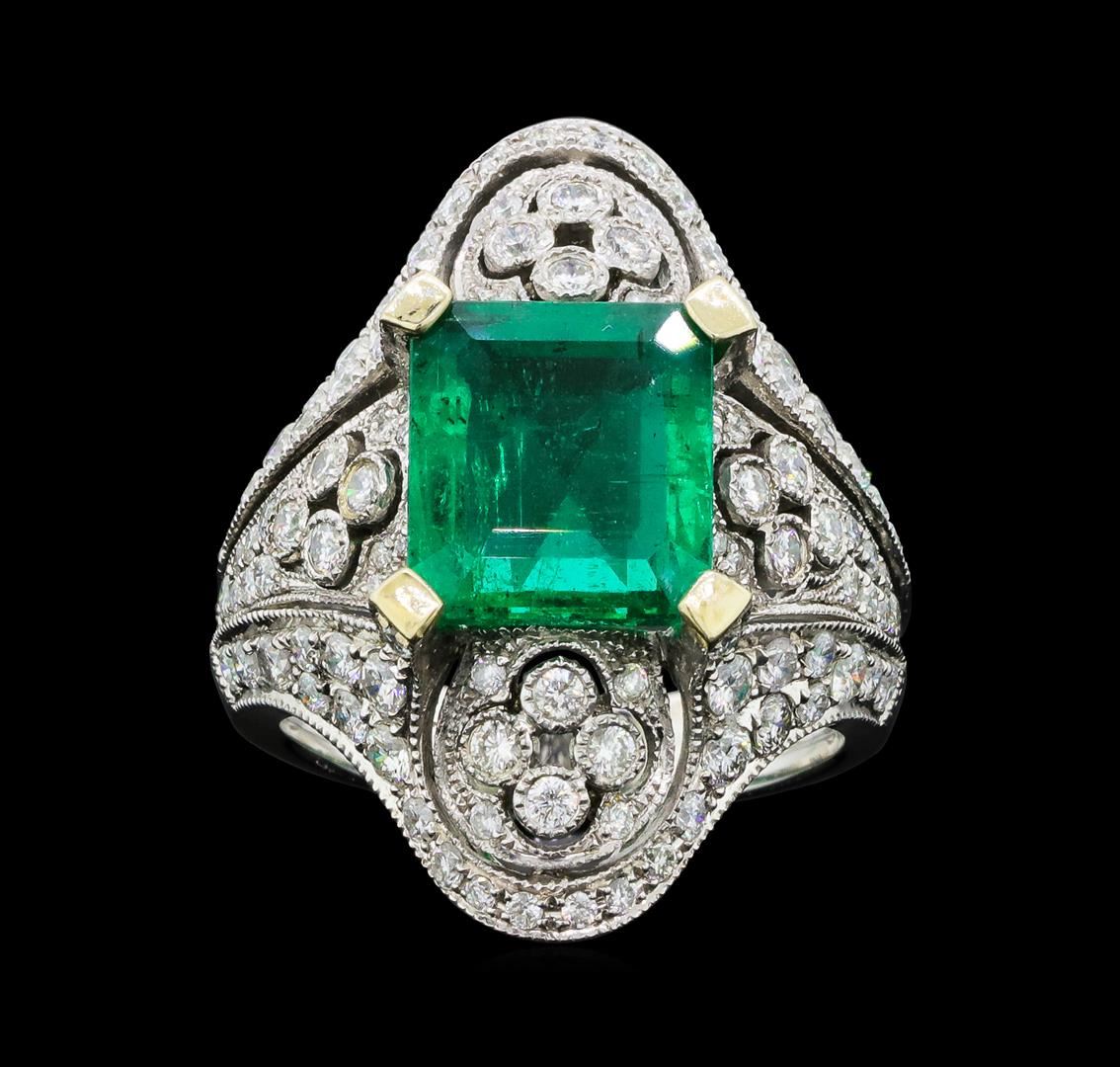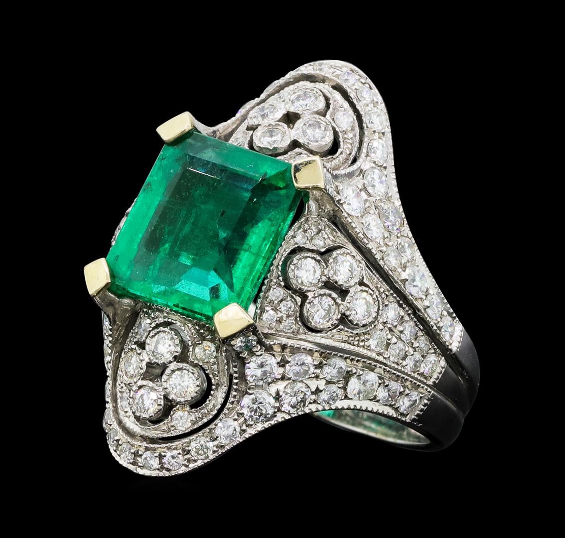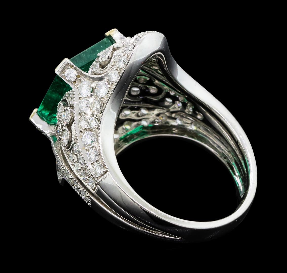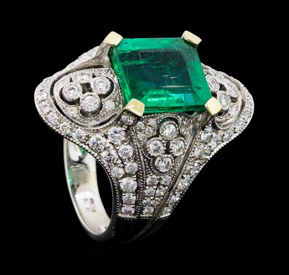 One electronically tested 18KT white gold lady's combination cast & assembled vintage style fashion ring with a tapered shank with a bright polish with milgrain detailing finish. The featured lady's ring has a shank measuring 3.75 millimeters wide. Identified with markings of '18K 750'. Condition is new, good workmanship. Containing: One prong set emerald standard step cut natural emerald, measuring 10.20 x 9.18 x 5.26mm, (depth est.) 10%. bulge factor, approximate weight of 4.05ct., clarity is slightly included, medium, strong, green color, (GIA G 5/5), cut is very good. Transmitting light with no distortion, transparent. Colored gemstones are presumed to have been subjected to commonly used enhancement processes. Graded in the setting. Sixteen prong set round brilliant cut diamonds, measuring 2.10 - 2.00 x 1.27mm (depth est.) approximate total weight of 16 Stones = 0.52ct. Graded in the setting. Color H - I Clarity SI-1 to SI-2 Cut Good Sixteen bezel set round brilliant cut diamonds, measuring 1.80 - 1.70 x 1.09mm (depth est.) approximate total weight of 16 Stones = 0.33ct. Graded in the setting. Color H - I Clarity SI-1 to SI-2 Cut Good Thirty-Two prong set round brilliant cut diamonds, measuring 1.50 - 1.30 x 0.87mm (depth est.) approximate total weight of 32 Stones = 0.34ct. Graded in the setting. Color H - I Clarity SI-1 to I-1 Cut Good Forty-Four prong set round brilliant cut diamonds, measuring 1.10 - 0.90 x 0.62mm (depth est.) approximate total weight of 44 Stones = 0.17ct. Graded in the setting. Color H - I Clarity SI-1 to I-1 Cut Good. Total Weight of Colored Stones 4.05ct.. Total Weight of Diamonds 1.36ct.. Total Weight of Ring 10.70gm GAS Appraised at $29730.00. GAS Appraised at $29,730.00.