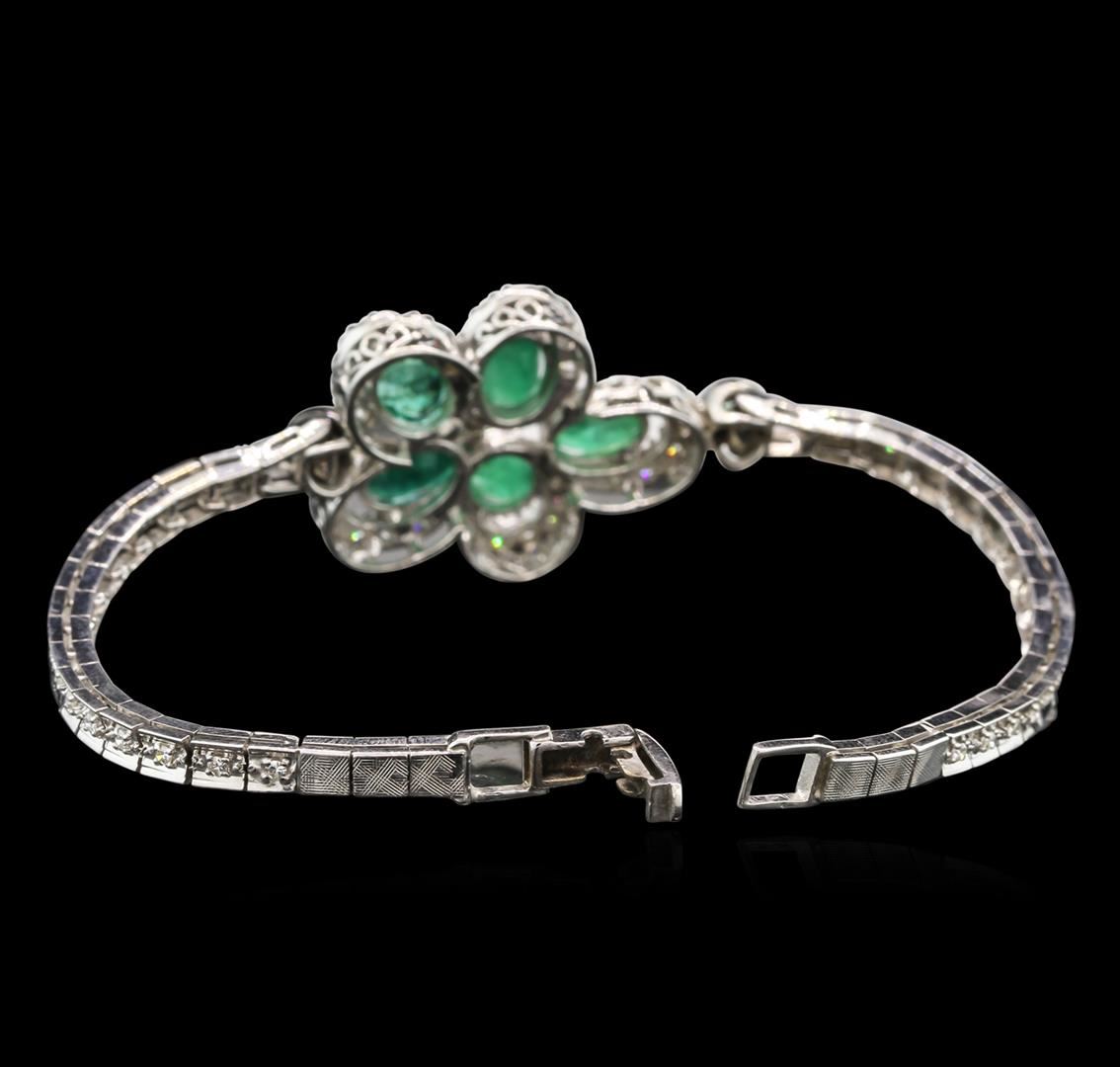 One electronically tested 14KT white gold ladies cast & assembled emerald and diamond bracelet. Seven and one-quarter inch length bracelet features a stylized emerald and diamond bezel floret design supported by a flexible diamond ribbon, terminating in a box clasp. Bright polish finish. Identified with markings of "14K". Condition is good. Containing: Five prong set oval mixed cut natural emeralds, measuring 8.00 x 5.00 x 3.25mm, 6%. bulge factor, approximate. Total Weight of 4.05ct., clarity is heavily included, type III, medium dark, very slightly grayish, very slightly bluish green color, (GIA vslbG 6/3), cut is good. Transmitting light somewhat diffusely, transparent to translucent. Naturally occurring internal & external characteristics are present. Measurements & the color grade are an average for the group. Indications of oil residue. Graded in the setting. Forty-Six prong set round brilliant cut diamonds, measuring 2.20 - 2.10 x 1.29mm (depth est.) approximate. Total Weight of 46 Stones = 1.77ct. Graded in the setting. Clarity: SI-2 to I-1. Color: H - J Thirty prong set single cut diamonds, measuring 1.30 - 1.20 x 0.75mm (depth est.) approximate. Total Weight of 30 Stones = 0.31ct. Graded in the setting. Clarity: VS-1 to VS-2. Color: H - J. Total Weight of Colored Stones 4.05ct. Total Weight of Diamonds 2.08ct. Total Weight of Bracelet 17.10gm. AIG Appraised at $10,510.00.