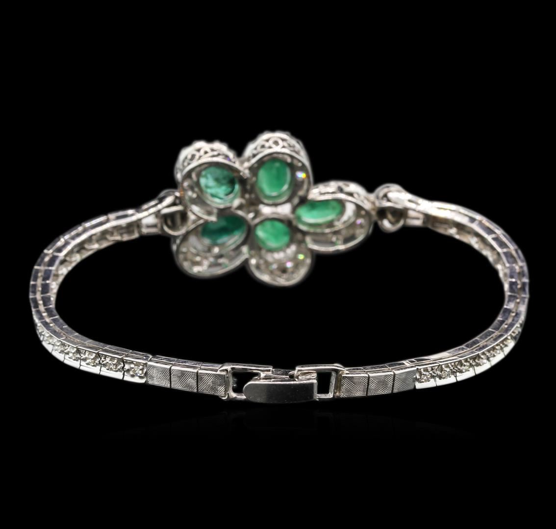One electronically tested 14KT white gold ladies cast & assembled emerald and diamond bracelet. Seven and one-quarter inch length bracelet features a stylized emerald and diamond bezel floret design supported by a flexible diamond ribbon, terminating in a box clasp. Bright polish finish. Identified with markings of "14K". Condition is good. Containing: Five prong set oval mixed cut natural emeralds, measuring 8.00 x 5.00 x 3.25mm, 6%. bulge factor, approximate. Total Weight of 4.05ct., clarity is heavily included, type III, medium dark, very slightly grayish, very slightly bluish green color, (GIA vslbG 6/3), cut is good. Transmitting light somewhat diffusely, transparent to translucent. Naturally occurring internal & external characteristics are present. Measurements & the color grade are an average for the group. Indications of oil residue. Graded in the setting. Forty-Six prong set round brilliant cut diamonds, measuring 2.20 - 2.10 x 1.29mm (depth est.) approximate. Total Weight of 46 Stones = 1.77ct. Graded in the setting. Clarity: SI-2 to I-1. Color: H - J Thirty prong set single cut diamonds, measuring 1.30 - 1.20 x 0.75mm (depth est.) approximate. Total Weight of 30 Stones = 0.31ct. Graded in the setting. Clarity: VS-1 to VS-2. Color: H - J. Total Weight of Colored Stones 4.05ct. Total Weight of Diamonds 2.08ct. Total Weight of Bracelet 17.10gm. AIG Appraised at $10,510.00.