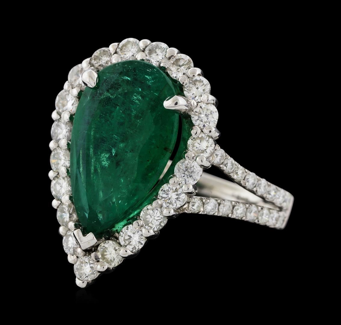 One electronically tested 14KT white gold lady's cast fashion ring with a split shank basket halo with a bright polish finish. The featured lady's ring has a shank measuring 2.25 millimeters wide. Identified with markings of '14K'. Condition is new, good workmanship. Containing: One prong set pear modified mixed cut natural emerald, measuring 15.00 x 9.02 x 4.56mm, (depth est.) 15%. bulge factor, approximate weight of 4.05ct., clarity is heavily included, medium, moderately strong, green color, (GIA G 5/4), cut is good. Transmitting light somewhat diffusely, semi-transparent to translucent. Naturally occurring internal & external characteristics are present. Indications of oil residue. Colored gemstones are presumed to have been subjected to commonly used enhancement processes. Graded in the setting. Twenty prong set round brilliant cut diamonds, measuring 2.35 - 2.25 x 1.43mm (depth est.) approximate total weight of 20 Stones = 0.92ct. Graded in the setting. Clarity SI-1 to I-1. Color: G - H Cut Good Thirty-Two prong set round brilliant cut diamonds, measuring 1.45 - 1.35 x 0.87mm (depth est.) approximate total weight of 32 Stones = 0.34ct. Graded in the setting. Clarity SI-1 to I-2. Color: G - I Cut Good. Total Weight of Colored Stones 4.05ct.. Total Weight of Diamonds 1.26ct.. Total Weight of Ring 5.40gm. GAS Appraised at $8,955.00.