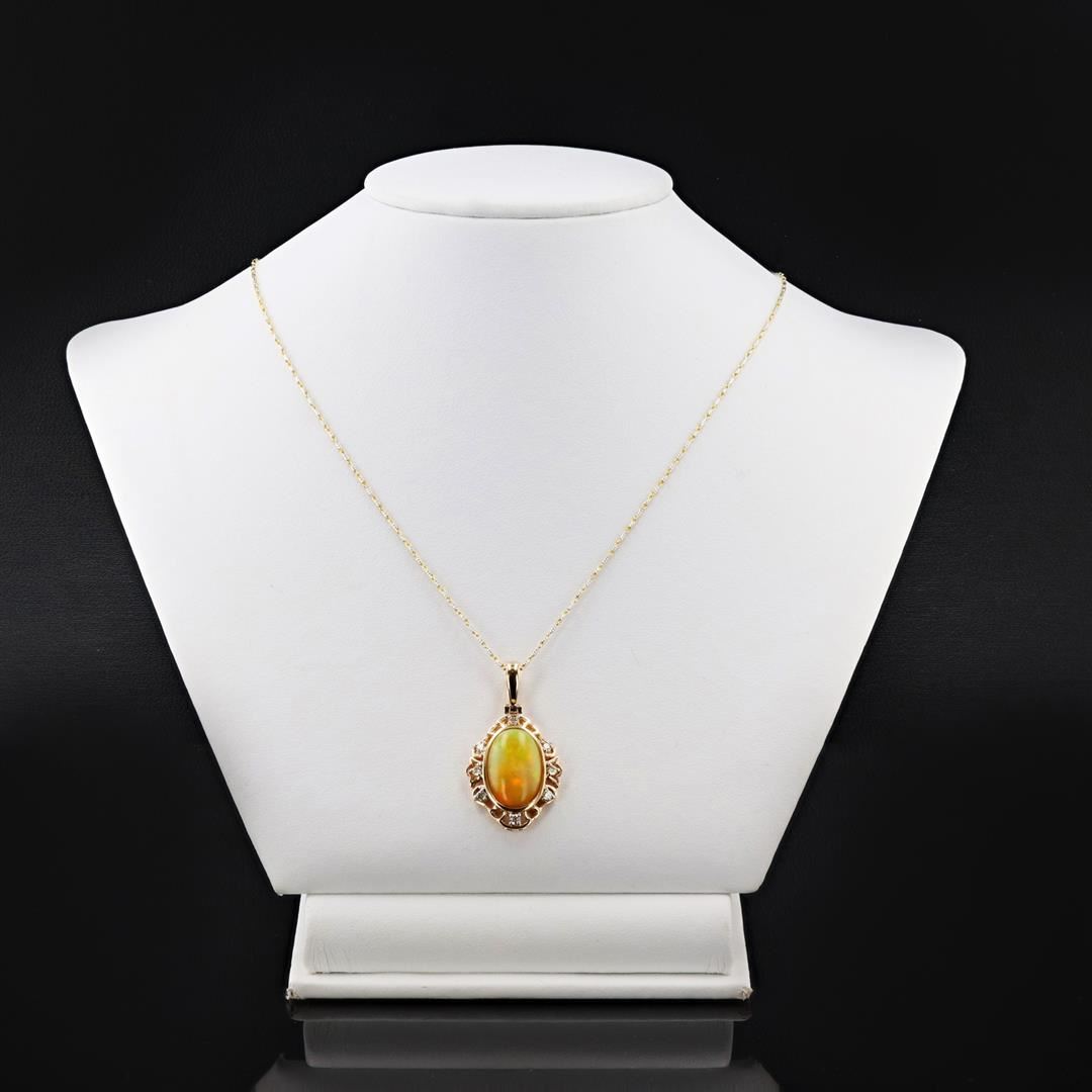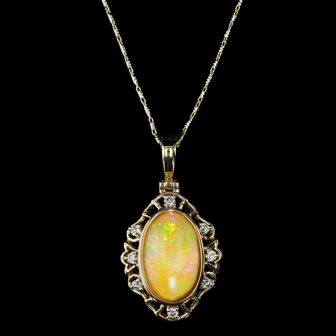 4.05ct Opal and 0.28ct Diamond Pendant on a 14K Yellow Gold Chain. Please see Photos and Description for all available information. This pendant features a 4.05ct opal, 0.28ct diamond, and a 14K yellow gold chain. The pendant is 18-inches long and hangs in the center of the chain. This pendant can be worn every day, and is still perfect for a formal dress.