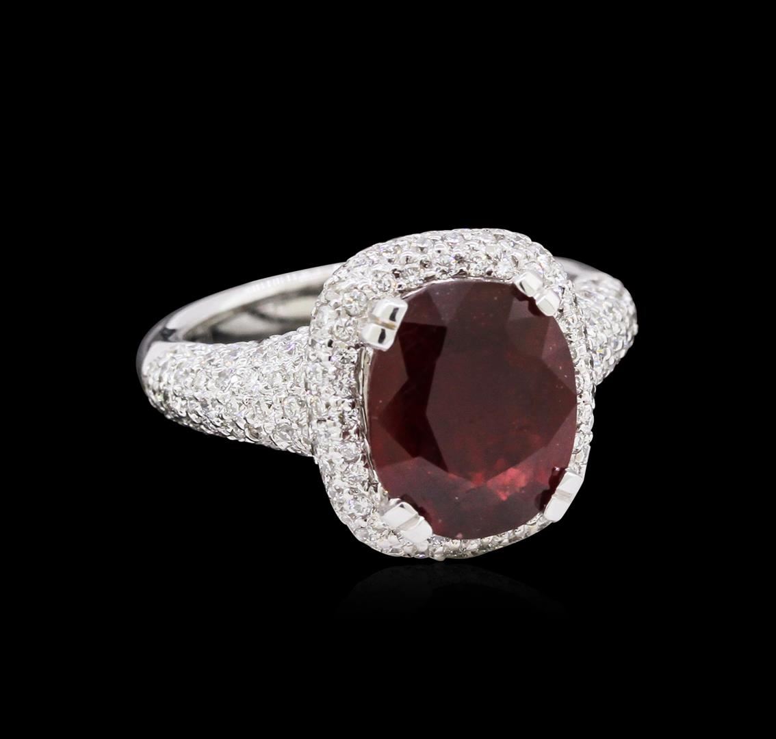 One electronically tested 18KT white gold lady's cast fashion ring with a tapered shank with a bright polish finish. The featured lady's ring has a shank measuring 3.00 millimeters wide. Identified with markings of "K18". Condition is new, good workmanship. Containing: One prong set oval modified brilliant cut natural ruby, measuring 10.91 x 8.90 x 5.10mm, approximate weight of 4.05ct., clarity is heavily included, type II, medium dark, moderately strong, slightly purplish red color, (GIA slpR 6/4), cut is very good. Naturally occurring internal & external characteristics are present. Indications of laboratory high temperature heat treatment, with glass & flux additives. Graded in the setting. One Hundred Ninety-Eight prong set round brilliant cut diamonds, measuring 1.30 - 1.10 x 0.74mm (depth est.) approximate total weight of 198 Stones = 1.29ct. Graded in the setting. Clarity: SI-1 to SI-2. Color: G - I. Cut Good. Total Weight of Colored Stones 4.05ct. Total Weight of Diamonds 1.29ct. Total Weight of Ring 8.80gm. GAS Appraised at $8,220.00.