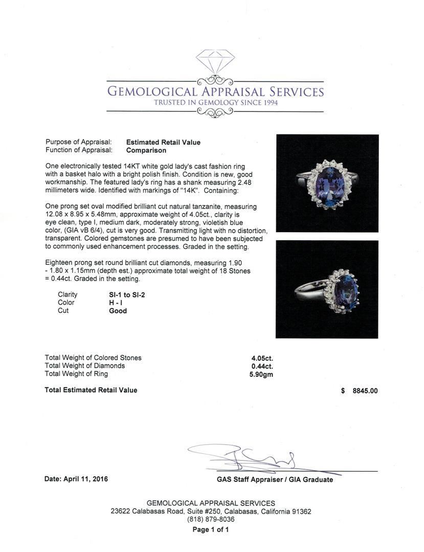One electronically tested 14KT white gold lady's cast fashion ring with a basket halo with a bright polish finish. The featured lady's ring has a shank measuring 2.48 millimeters wide. Identified with markings of "14K". Condition is new, good workmanship. Containing: One prong set oval modified brilliant cut natural tanzanite, measuring 12.08 x 8.95 x 5.48mm, approximate weight of 4.05ct., clarity is eye clean, type I, medium dark, moderately strong, violetish blue color, (GIA vB 6/4), cut is very good. Transmitting light with no distortion, transparent. Colored gemstones are presumed to have been subjected to commonly used enhancement processes. Graded in the setting. Eighteen prong set round brilliant cut diamonds, measuring 1.90 - 1.80 x 1.15mm (depth est.) approximate total weight of 18 Stones = 0.44ct. Graded in the setting. Clarity: SI-1 to SI-2. Color: H - I. Cut Good. Total Weight of Colored Stones 4.05ct. Total Weight of Diamonds 0.44ct. Total Weight of Ring 5.90gm.