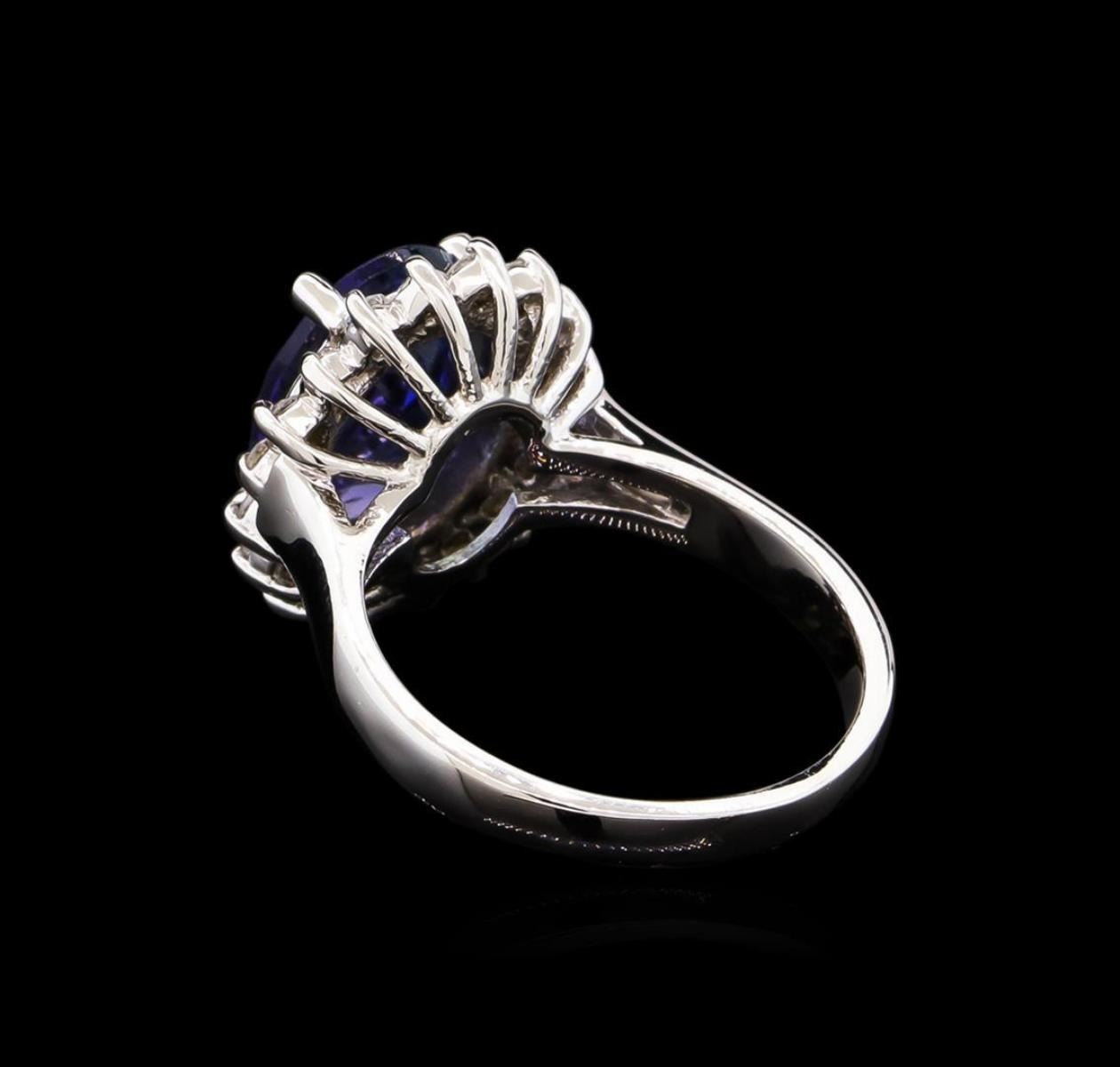 One electronically tested 14KT white gold lady's cast fashion ring with a basket halo with a bright polish finish. The featured lady's ring has a shank measuring 2.48 millimeters wide. Identified with markings of "14K". Condition is new, good workmanship. Containing: One prong set oval modified brilliant cut natural tanzanite, measuring 12.08 x 8.95 x 5.48mm, approximate weight of 4.05ct., clarity is eye clean, type I, medium dark, moderately strong, violetish blue color, (GIA vB 6/4), cut is very good. Transmitting light with no distortion, transparent. Colored gemstones are presumed to have been subjected to commonly used enhancement processes. Graded in the setting. Eighteen prong set round brilliant cut diamonds, measuring 1.90 - 1.80 x 1.15mm (depth est.) approximate total weight of 18 Stones = 0.44ct. Graded in the setting. Clarity: SI-1 to SI-2. Color: H - I. Cut Good. Total Weight of Colored Stones 4.05ct. Total Weight of Diamonds 0.44ct. Total Weight of Ring 5.90gm.