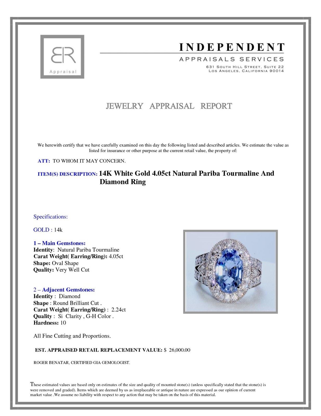 14K WHITE GOLD NATURAL COPPER BEARING PARIBA TOURMALINE RING :6.93 GRaMS/AGTA/DIAMOND :2.24CT / COPPER BEARING PARIBA TOURMALINE :4.05CT/#GVR1253 **In warm 14kt white gold, this handsome style features a stunning blue 4.05ct oval shape Natural Paraiba Tourmaline center stone, one of the premiere stones for self healing. Framed with shimmering 2.24ct Round Brilliant Cut Diamonds art-fully crafted down its dual shank, intricate detailing and touch of subtle sparkle adds to its richness and depth. this cocktail ring is an investment piece and secure purchase.**