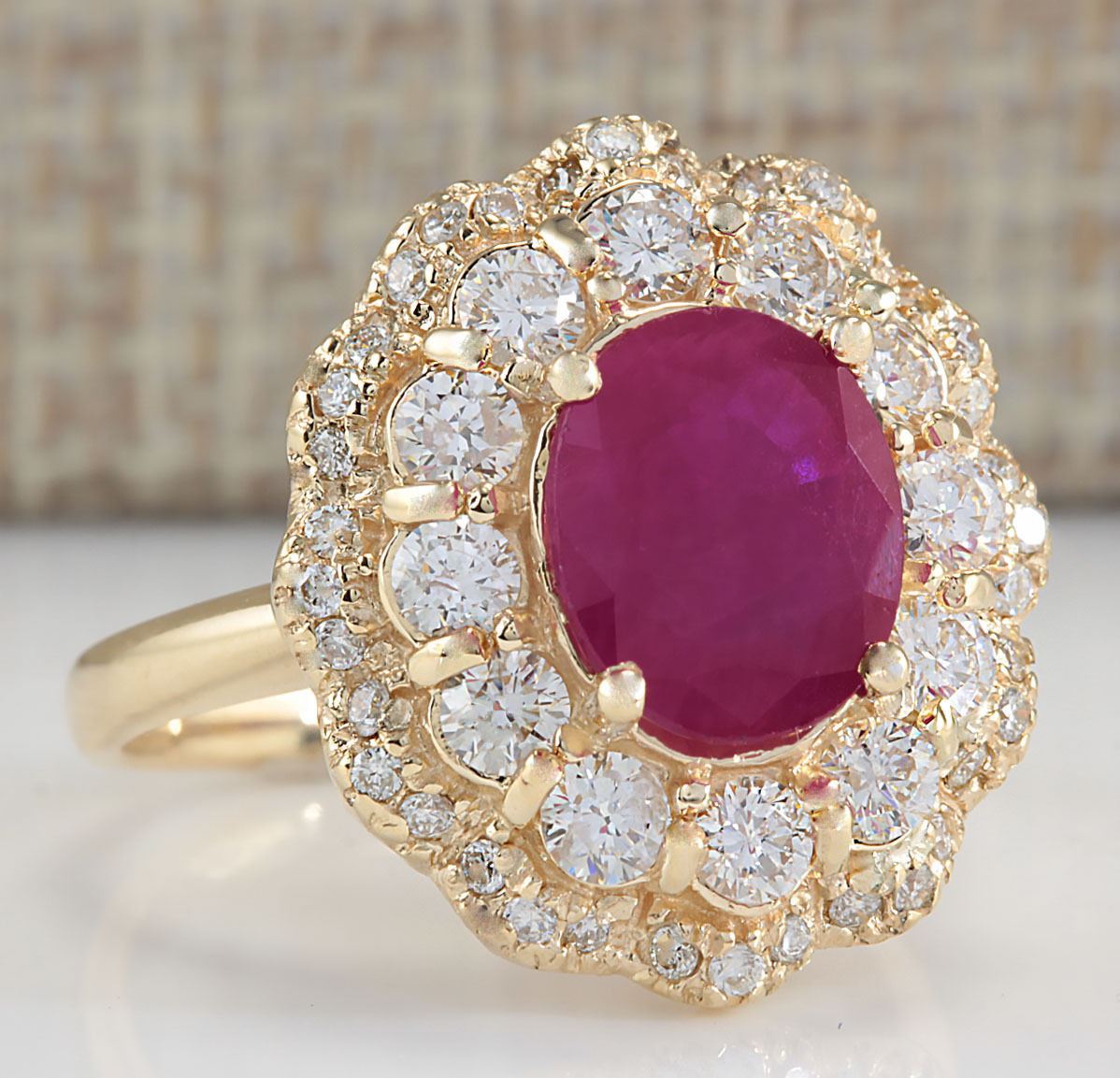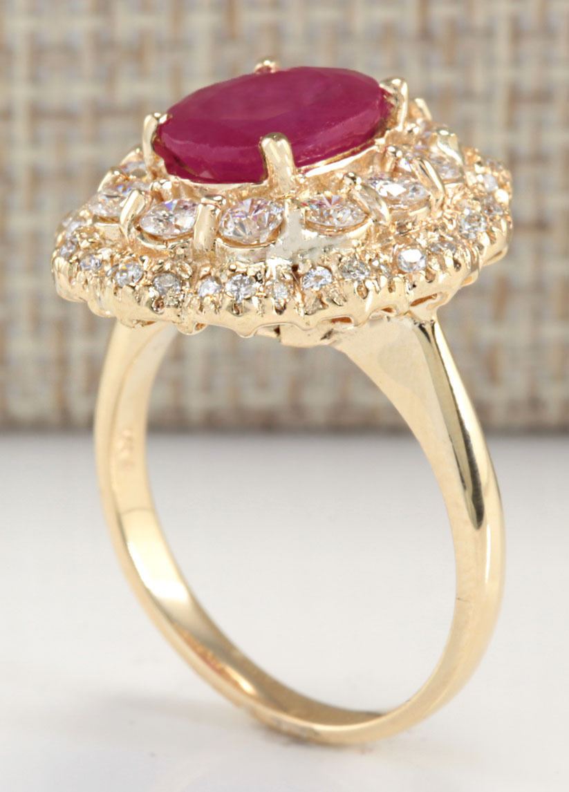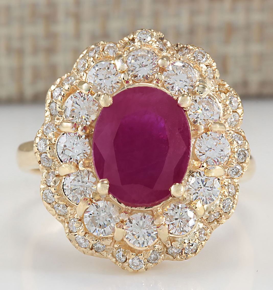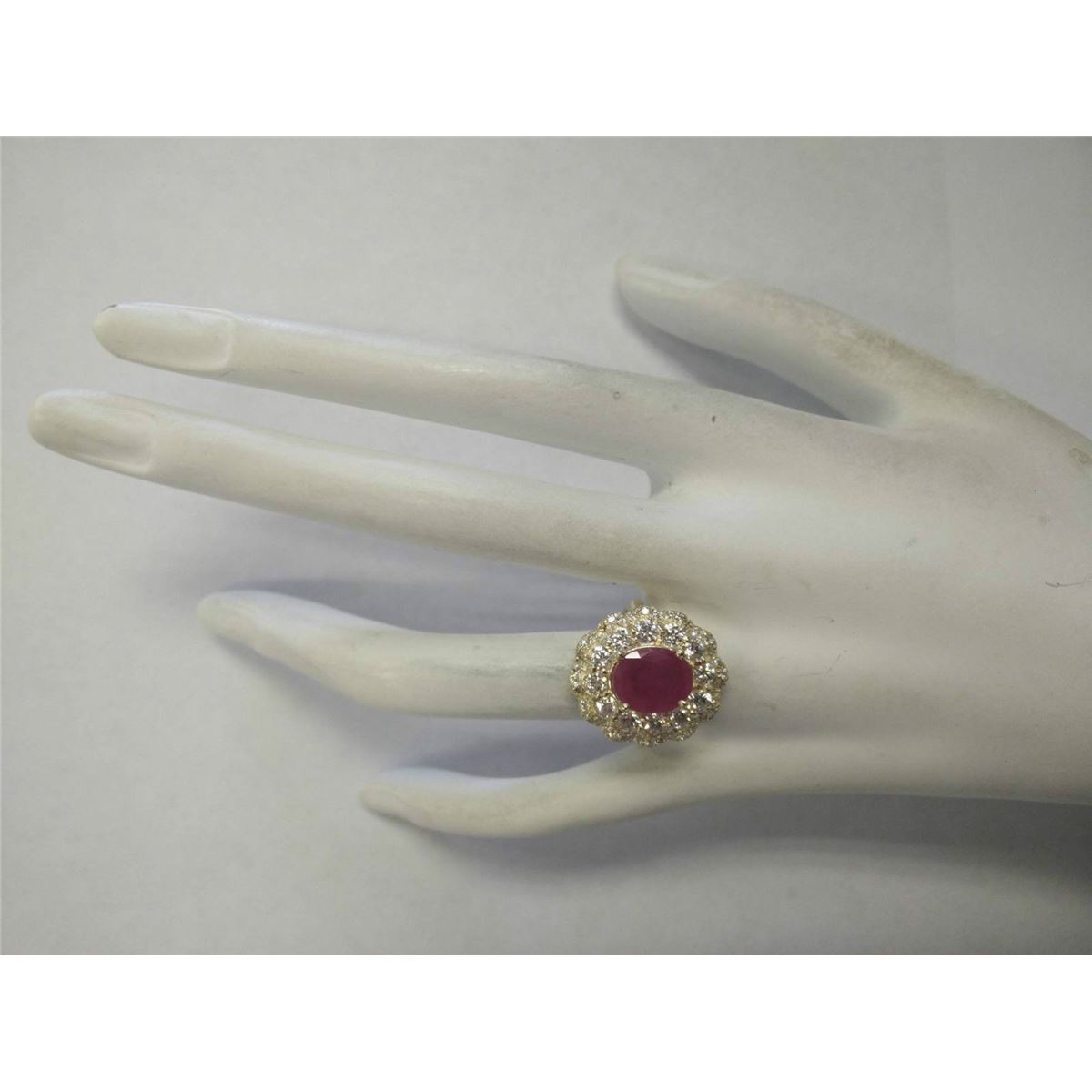 Stamped: 14K Ring Size: 7 Total Ring Weight: 7 Grams Diamond Weight: Total natural diamond weight is 1.30carat. SI1-SI2 clarity / G-H color Gemstone Weight: Total Natural Ruby Weight is 2.75ctw (Measures: 9.45x7.85mm) No glass or led filling natural African ruby heated only Face Measures: 19.60x17.47mm Main stone color: Red [SKU:702134]