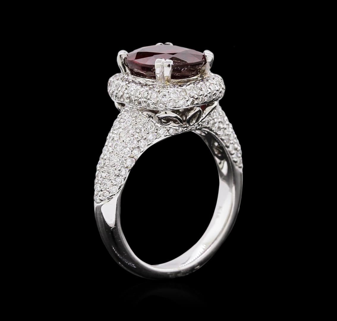 One electronically tested 18KT white gold lady's cast fashion ring with a tapered shank with a bright polish finish. The featured lady's ring has a shank measuring 3.00 millimeters wide. Identified with markings of "K18". Condition is new, good workmanship. Containing: One prong set oval modified brilliant cut natural ruby, measuring 10.91 x 8.90 x 5.10mm, approximate weight of 4.05ct., clarity is heavily included, type II, medium dark, moderately strong, slightly purplish red color, (GIA slpR 6/4), cut is very good. Naturally occurring internal & external characteristics are present. Indications of laboratory high temperature heat treatment, with glass & flux additives. Graded in the setting. One Hundred Ninety-Eight prong set round brilliant cut diamonds, measuring 1.30 - 1.10 x 0.74mm (depth est.) approximate total weight of 198 Stones = 1.29ct. Graded in the setting. Clarity: SI-1 to SI-2. Color: G - I. Cut Good. Total Weight of Colored Stones 4.05ct. Total Weight of Diamonds 1.29ct. Total Weight of Ring 8.80gm. GAS Appraised at $8,220.00.