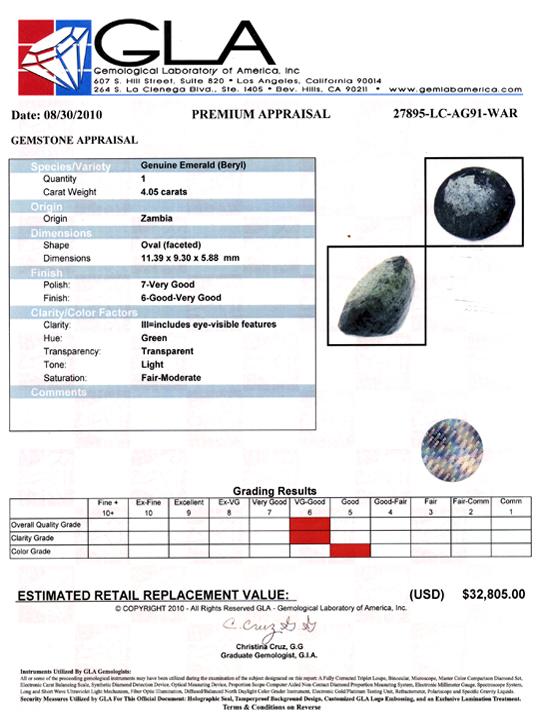 Excellent green colored specimen oval cut; lab quality evaluation 6; treatment as noted; Gem Guide wholesale $6075-$8100; full retail appraisal $32805; full lab evaluation included