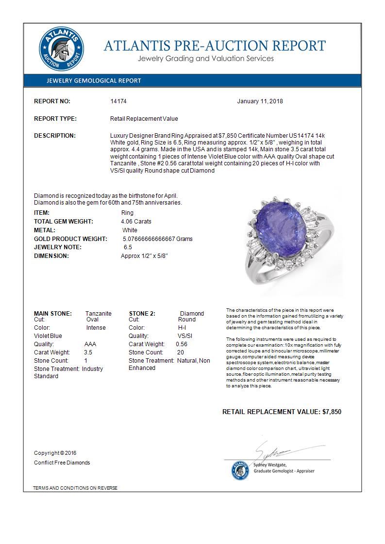 REF-101X6T -14174 ---- 4.06 CTW Tanzanite & Diamond Ring 14K White Gold ---- Luxury Designer Brand Ring Appraised at $7,850 Certificate Number US14174 14k White gold, Ring Size is 6.5, Ring measuring approx. 1/2" x 5/8" , weighing in total approx. 4.4 grams. Made in the USA and is stamped 14k, Main stone 3.5 carat total weight containing 1 pieces of Intense Violet Blue color with AAA quality Oval shape cut Tanzanite , Stone #2 0.56 carat total weight containing 20 pieces of H-I color with VS/SI quality Round shape cut Diamond