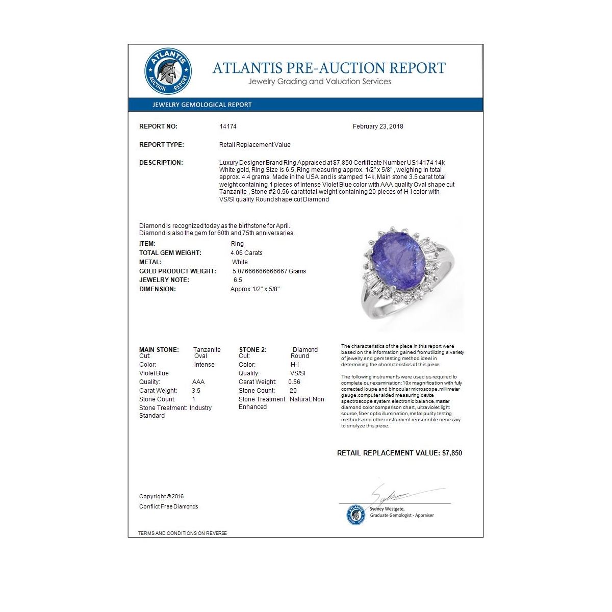 REF-101X6T -14174 ---- 4.06 CTW Tanzanite & Diamond Ring 14K White Gold ---- Luxury Designer Brand Ring Appraised at $7,850 Certificate Number US14174 14k White gold, Ring Size is 6.5, Ring measuring approx. 1/2" x 5/8" , weighing in total approx. 4.4 grams. Made in the USA and is stamped 14k, Main stone 3.5 carat total weight containing 1 pieces of Intense Violet Blue color with AAA quality Oval shape cut Tanzanite , Stone #2 0.56 carat total weight containing 20 pieces of H-I color with VS/SI quality Round shape cut Diamond