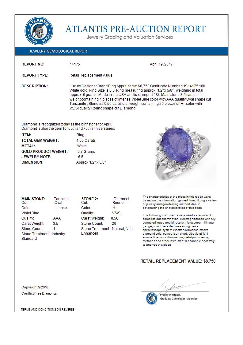 4.06 CTW Tanzanite & Diamond Ring 18K White Gold ---- Luxury Designer Brand Ring Appraised Retail Price at $8,750 ---- SKU Number US14175 18k White gold Ring Size is 6.5, Ring measuring approx. 1/2" x 5/8" , weighing in total approx. 6 grams. Made in the USA and is stamped 18k, Main stone 3.5 carat total weight containing 1 pieces of Intense Violet Blue color with AAA quality Oval shape cut Tanzanite , Stone #2 0.56 carat total weight containing 20 pieces of H-I color with VS/SI quality Round shape cut