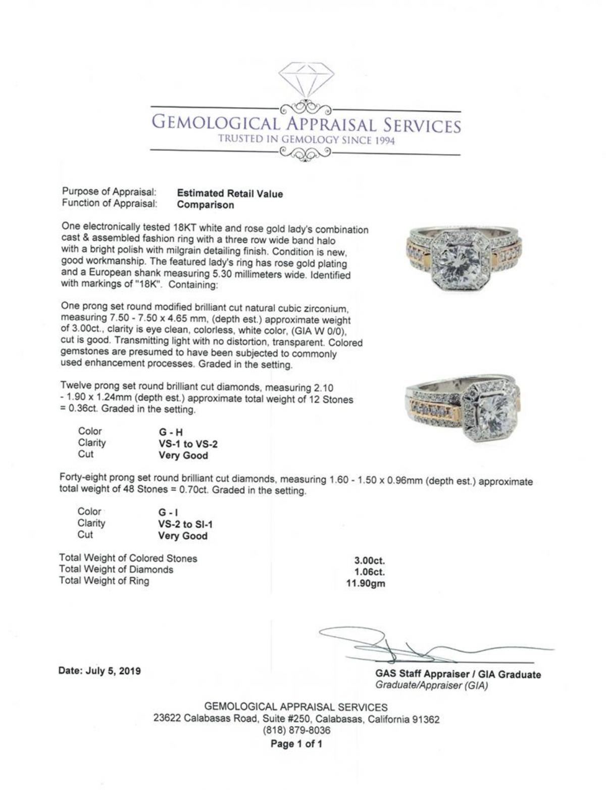 One electronically tested 18KT white and rose gold lady's combination cast & assembled fashion ring with a three row wide band halo with a bright polish with milgrain detailing finish. The featured lady's ring has rose gold plating and a European shank measuring 5.30 millimeters wide. Identified with markings of '18K'. Condition is new, good workmanship. Containing: One prong set round modified brilliant cut natural cubic zirconium, measuring 7.50 - 7.50 x 4.65 mm, (depth est.) approximate weight of 3.00ct., clarity is eye clean, colorless, white color, (GIA W 0/0), cut is good. Transmitting light with no distortion, transparent. Colored gemstones are presumed to have been subjected to commonly used enhancement processes. Graded in the setting. Twelve prong set round brilliant cut diamonds, measuring 2.10 - 1.90 x 1.24mm (depth est.) approximate total weight of 12 Stones = 0.36ct. Graded in the setting. Color G - H Clarity VS-1 to VS-2 Cut Very Good Forty-Eight prong set round brilliant cut diamonds, measuring 1.60 - 1.50 x 0.96mm (depth est.) approximate total weight of 48 Stones = 0.70ct. Graded in the setting. Color G - I Clarity VS-2 to SI-1 Cut Very Good. Total Weight of Colored Stones 3.00ct.. Total Weight of Diamonds 1.06ct.. Total Weight of Ring 11.90gm GAS Appraised at $5640.00. GAS Appraised.