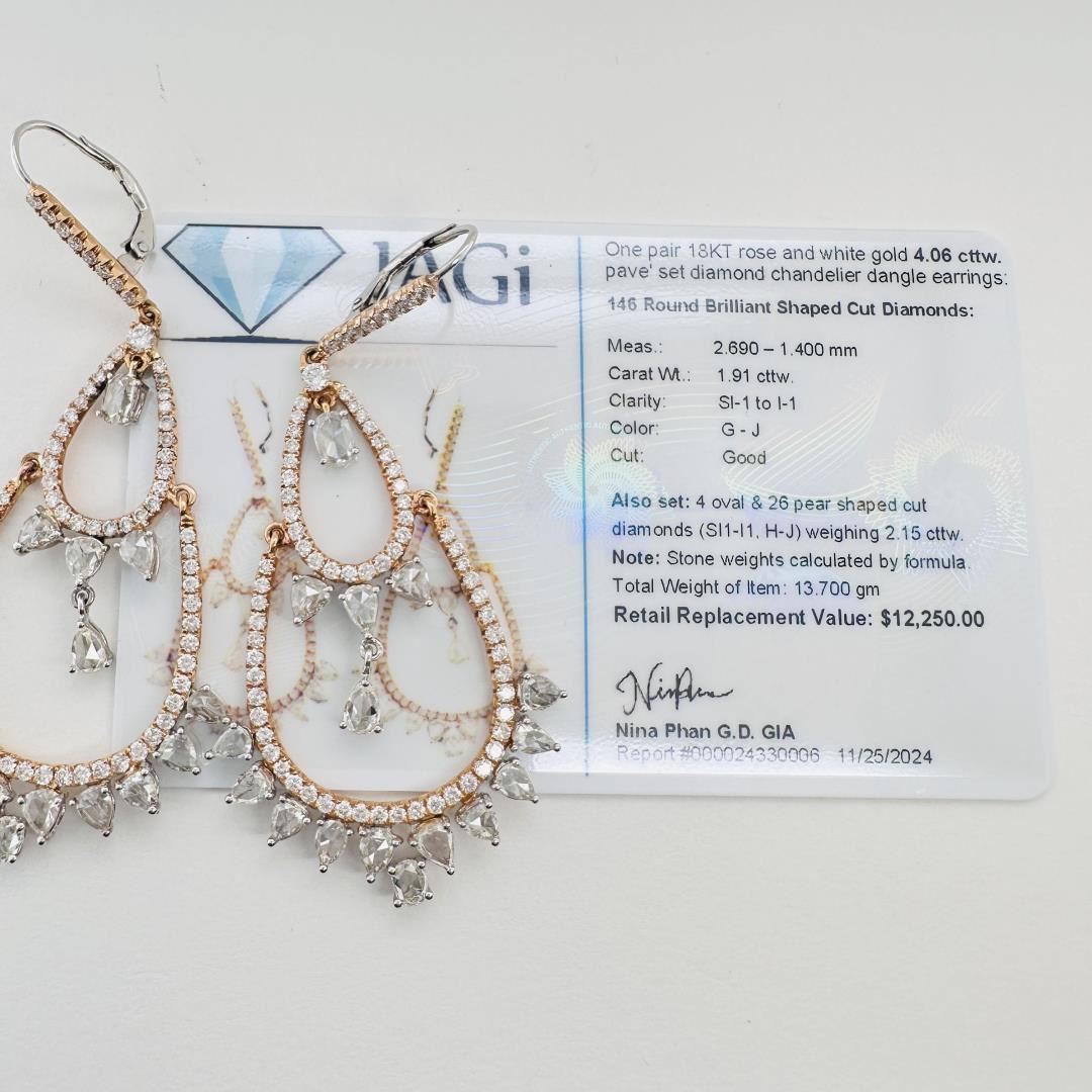 These elegant 18K rose and white gold pave set diamond chandelier dangle earrings feature 146 round brilliant shaped cut diamonds weighing 1.91 cttw, with SI-1 to I-1 clarity and G-J color, exhibiting a Good cut. Also set are 4 oval and 26 pear shaped cut diamonds weighing 2.15 cttw, with SI1-I1 clarity and H-J color. The total item weight is 13.700 gm.