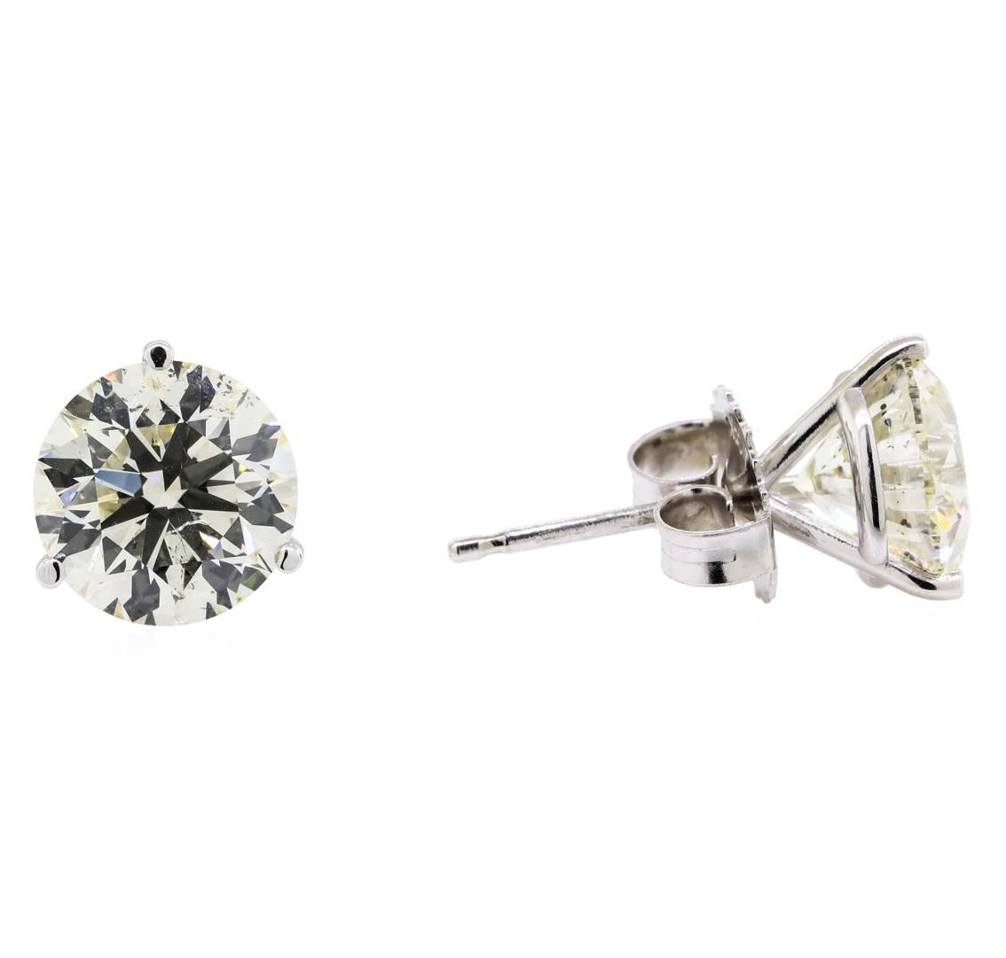 One pair electronically tested 18KT white gold lady's combination cast & assembled fashion stud earrings with friction posts with a three prong martini basket with a bright polish finish. Identified with markings of '14K'. Condition is new, good workmanship. Containing: Two prong set round brilliant cut diamonds, measuring 8.06 - 8.00 x 5.10mm (depth est.) approximate total weight of 2 Stones = 4.06ct. Graded in the setting. Color H - I Clarity SI-1 Cut Very Good. Total Weight of Diamonds 4.06ct.. Total Weight of Earrings 2.00gm GAS Appraised at $71715.00. GAS Appraised at $71,715.00.