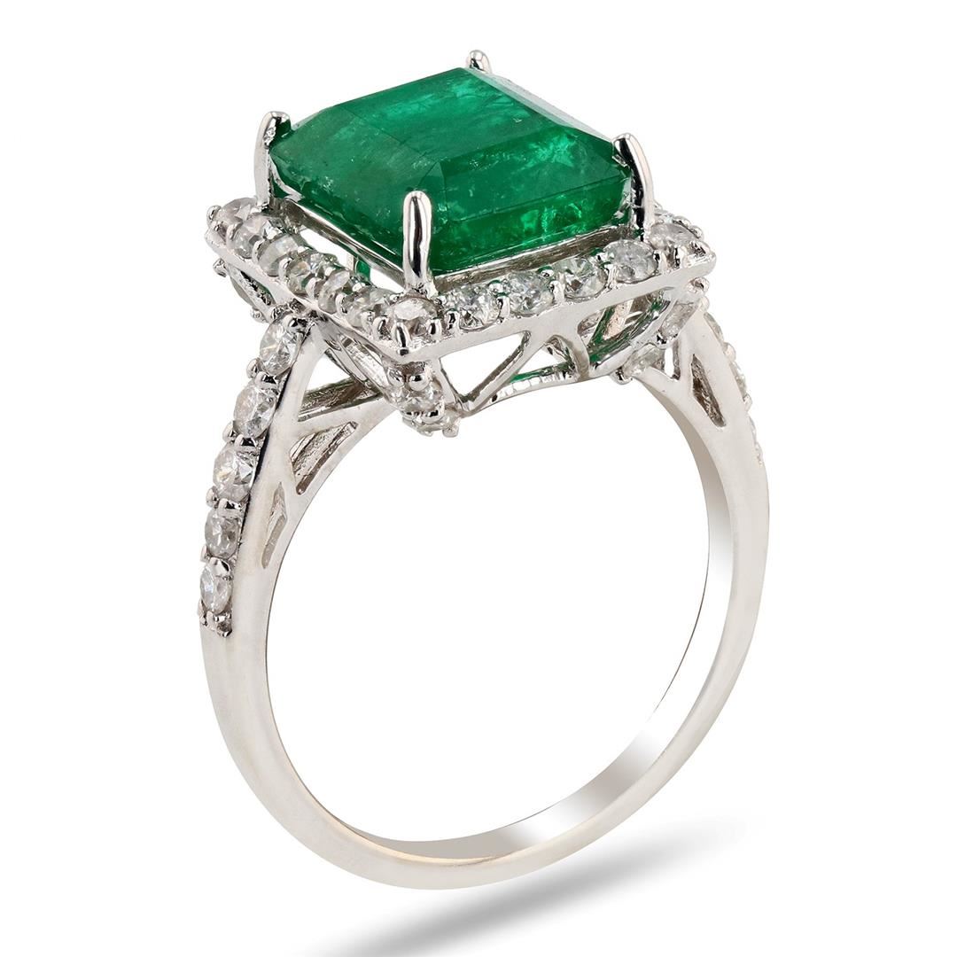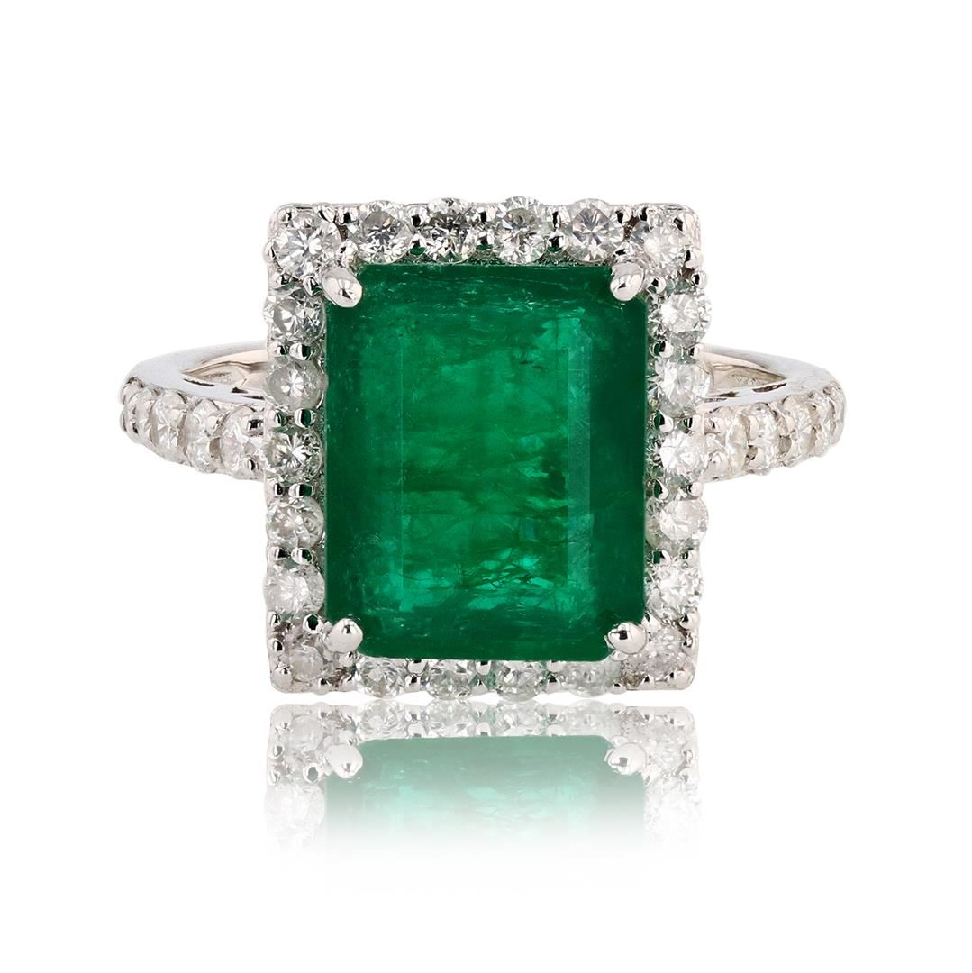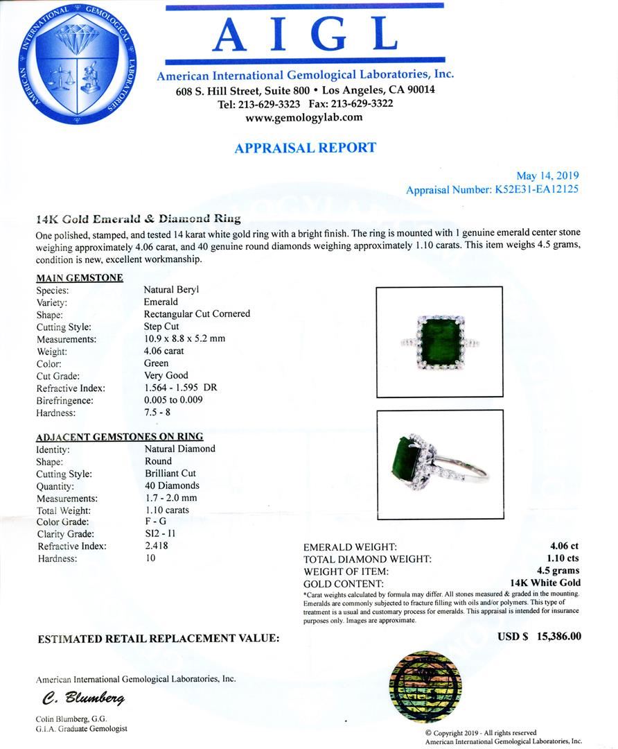 I4K Gold Emerald & Diamond Ring One polished, stamped, and tested 14 karat white gold ring with a bright finish. The ring is mounted with 1 genuine emerald center stone weighing approximately 4.06 carat, and 40 genuine round diamonds weighing approximately 1.10 carats. This item weighs 4.5 grams, condition is new, excellent workmanship. MAIN GEMSTONE Species: Natural Beryl Variety: Emerald Shape: Rectangular Cut Cornered Cutting Style: Step Cut Measurements: 10.9 x 8.8 x 5.2 mm Weight: 4.06 carat Color: Green Cut Grade: Very Good Refractive Index: 1.564 - 1.595 DR Birefringence: 0.005 to 0.009 Hardness: 7.5 - 8 ADJACENT GEMSTONES ON RING Identity: Natural Diamond Shape: Round Cutting Style: Brilliant Cut Quantity: 40 Diamonds Measurements: 1.7 - 2.0 mm Total Weight: 1.10 carats Color Grade: F - G Clarity Grade: SI2 - I1 Refractive Index: 2.418 Hardness: 10 EMERALD WEIGHT: 4.06ct TOTAL DIAMOND WEIGHT: 1.10ctw WEIGHT OF ITEM: 4.5 grams GOLD CONTENT: 14K White Gold