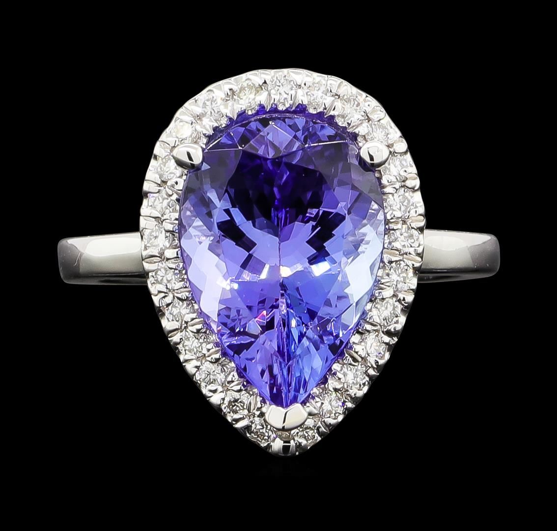 One electronically tested 14KT white gold lady's cast fashion ring with a basket halo with a bright polish finish. The featured lady's ring has a shank measuring 1.95 millimeters wide. Identified with markings of '14K'. Condition is new, good workmanship. Containing: One prong set pear modified brilliant cut natural tanzanite, measuring 13.05 x 9.15 x 5.83mm, (depth est.) approximate weight of 4.06ct., clarity is eye clean, medium, moderately strong, bluish violet color, (GIA bV 5/4), cut is good. Transmitting light with no distortion, transparent. Colored gemstones are presumed to have been subjected to commonly used enhancement processes. Graded in the setting. Twenty-Five prong set round brilliant cut diamonds, measuring 1.40 - 1.35 x 0.86mm (depth est.) approximate total weight of 25 Stones = 0.25ct. Graded in the setting. Clarity SI-1 to SI-2. Color: H - I Cut Good. Total Weight of Colored Stones 4.06ct.. Total Weight of Diamonds 0.25ct.. Total Weight of Ring 5.10gm. GAS Appraised at $7,580.00.