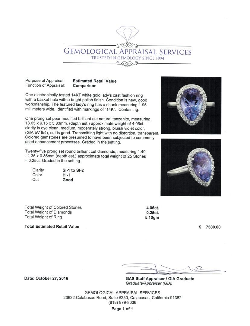 One electronically tested 14KT white gold lady's cast fashion ring with a basket halo with a bright polish finish. The featured lady's ring has a shank measuring 1.95 millimeters wide. Identified with markings of '14K'. Condition is new, good workmanship. Containing: One prong set pear modified brilliant cut natural tanzanite, measuring 13.05 x 9.15 x 5.83mm, (depth est.) approximate weight of 4.06ct., clarity is eye clean, medium, moderately strong, bluish violet color, (GIA bV 5/4), cut is good. Transmitting light with no distortion, transparent. Colored gemstones are presumed to have been subjected to commonly used enhancement processes. Graded in the setting. Twenty-Five prong set round brilliant cut diamonds, measuring 1.40 - 1.35 x 0.86mm (depth est.) approximate total weight of 25 Stones = 0.25ct. Graded in the setting. Clarity SI-1 to SI-2. Color: H - I Cut Good. Total Weight of Colored Stones 4.06ct.. Total Weight of Diamonds 0.25ct.. Total Weight of Ring 5.10gm. GAS Appraised at $7,580.00.
