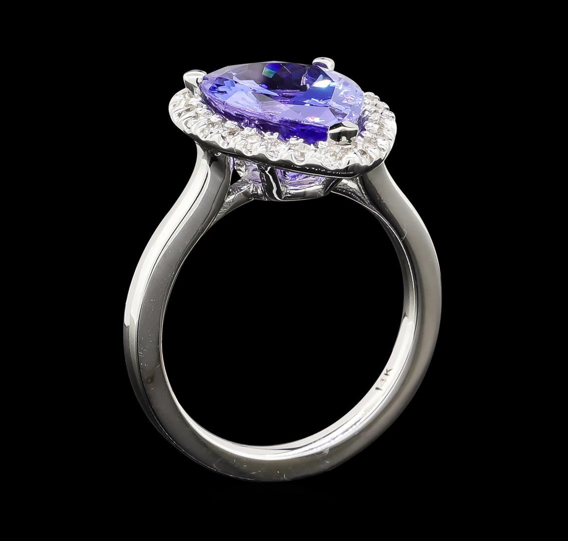 One electronically tested 14KT white gold lady's cast fashion ring with a basket halo with a bright polish finish. The featured lady's ring has a shank measuring 1.95 millimeters wide. Identified with markings of '14K'. Condition is new, good workmanship. Containing: One prong set pear modified brilliant cut natural tanzanite, measuring 13.05 x 9.15 x 5.83mm, (depth est.) approximate weight of 4.06ct., clarity is eye clean, medium, moderately strong, bluish violet color, (GIA bV 5/4), cut is good. Transmitting light with no distortion, transparent. Colored gemstones are presumed to have been subjected to commonly used enhancement processes. Graded in the setting. Twenty-Five prong set round brilliant cut diamonds, measuring 1.40 - 1.35 x 0.86mm (depth est.) approximate total weight of 25 Stones = 0.25ct. Graded in the setting. Clarity SI-1 to SI-2. Color: H - I Cut Good. Total Weight of Colored Stones 4.06ct.. Total Weight of Diamonds 0.25ct.. Total Weight of Ring 5.10gm. GAS Appraised at $7,580.00.