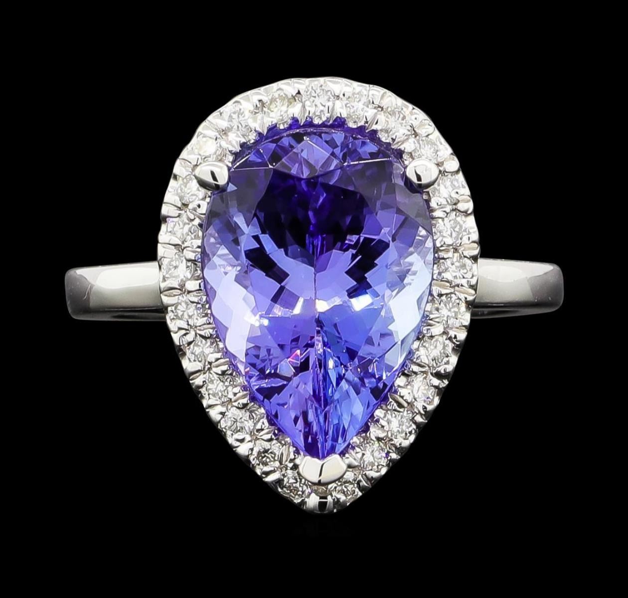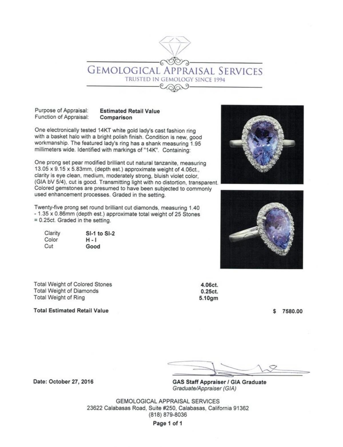 One electronically tested 14KT white gold lady's cast fashion ring with a basket halo with a bright polish finish. The featured lady's ring has a shank measuring 1.95 millimeters wide. Identified with markings of '14K'. Condition is new, good workmanship. Containing: One prong set pear modified brilliant cut natural tanzanite, measuring 13.05 x 9.15 x 5.83mm, (depth est.) approximate weight of 4.06ct., clarity is eye clean, medium, moderately strong, bluish violet color, (GIA bV 5/4), cut is good. Transmitting light with no distortion, transparent. Colored gemstones are presumed to have been subjected to commonly used enhancement processes. Graded in the setting. Twenty-Five prong set round brilliant cut diamonds, measuring 1.40 - 1.35 x 0.86mm (depth est.) approximate total weight of 25 Stones = 0.25ct. Graded in the setting. Clarity SI-1 to SI-2. Color: H - I Cut Good. Total Weight of Colored Stones 4.06ct.. Total Weight of Diamonds 0.25ct.. Total Weight of Ring 5.10gm. GAS Appraised.