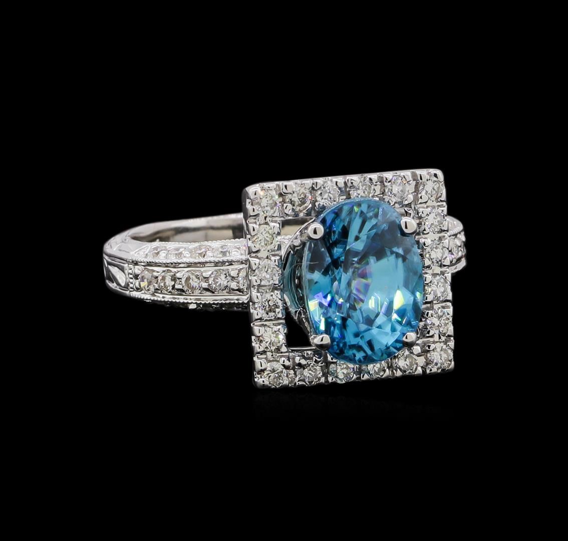 One electronically tested 18KT white gold ladies cast blue zircon and diamond ring. The featured blue zircon is set within a diamond bezel supported by diamond set decorative shoulders, completed by a two millimeter wide band. Bright and patterned finish with milgrain detailing. Identified with markings of '18K'. Condition is new, good workmanship. Containing: One prong set oval mixed cut natural blue zircon, measuring 9.50 x 7.00 x 5.90mm, 5%. bulge factor, approximate weight of 4.07ct., clarity is eye clean, type I, medium dark, moderately strong, very strongly greenish blue color, (GIA vstgB 6/4), cut is good. Transmitting light with no distortion, transparent. Graded in the setting. Fifty prong set round brilliant cut diamonds, measuring 1.50 - 1.50 x 0.90mm (depth est.) approximate total weight of 50 Stones = 0.67ct. The clarity grade reflects the entire range of clarity for this group. Graded in the setting. Clarity SI-1 to I-2. Color: F - H Twenty-One prong set round brilliant cut diamonds, measuring 1.20 - 1.00 x 0.66mm (depth est.) approximate total weight of 21 Stones = 0.14ct. Graded in the setting. Clarity SI-2 to I-2. Color: G - I. Total Weight of Colored Stones 4.07ct.. Total Weight of Diamonds 0.81ct.. Total Weight of Ring 6.74gm. AIG Appraised at $5,735.00.