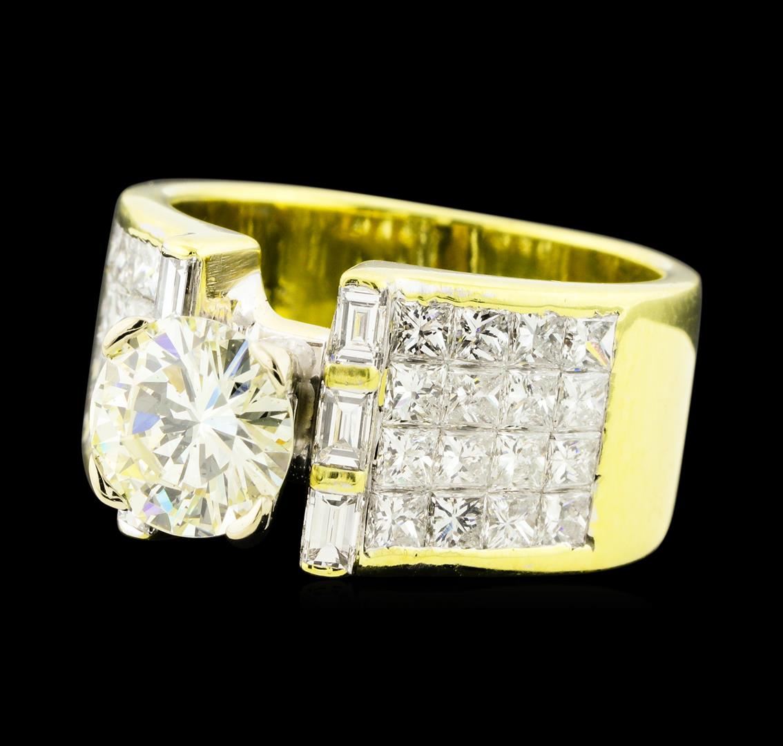 One electronically tested 18KT yellow gold lady's combination cast & assembled wedding ring with a wide band with a bright polish finish. The featured lady's ring has a shank measuring 8.52 millimeters wide. Identified with markings of '18K'. Condition is like new, good workmanship. Containing: One prong set round brilliant cut diamond, measuring 7.55 - 7.52 x 4.53mm (depth est.) approximate weight of 1.57ct. Graded in the setting. Clarity VS-1. Color: J - K Cut Very Good Six channel set baguette cut diamonds, measuring from 2.80 x 1.70 x 1.45mm (depth est.) to 3.00 x 1.90 x 1.62mm (depth est.) approximate total weight of 6 Stones = 0.44ct. Graded in the setting. Clarity VS-1 to VS-2. Color: G - H Cut Very Good Thirty-Two invisible set princess cut diamonds, measuring 2.30 x 2.15 x 1.62mm (depth est.) approximate total weight of 32 Stones = 2.06ct. Graded in the setting. Clarity VS-2 to SI-1. Color: G - H Cut Very Good. Total Weight of Diamonds 4.07ct.. Total Weight of Ring 12.50gm. GAS Appraised at $27,110.00.