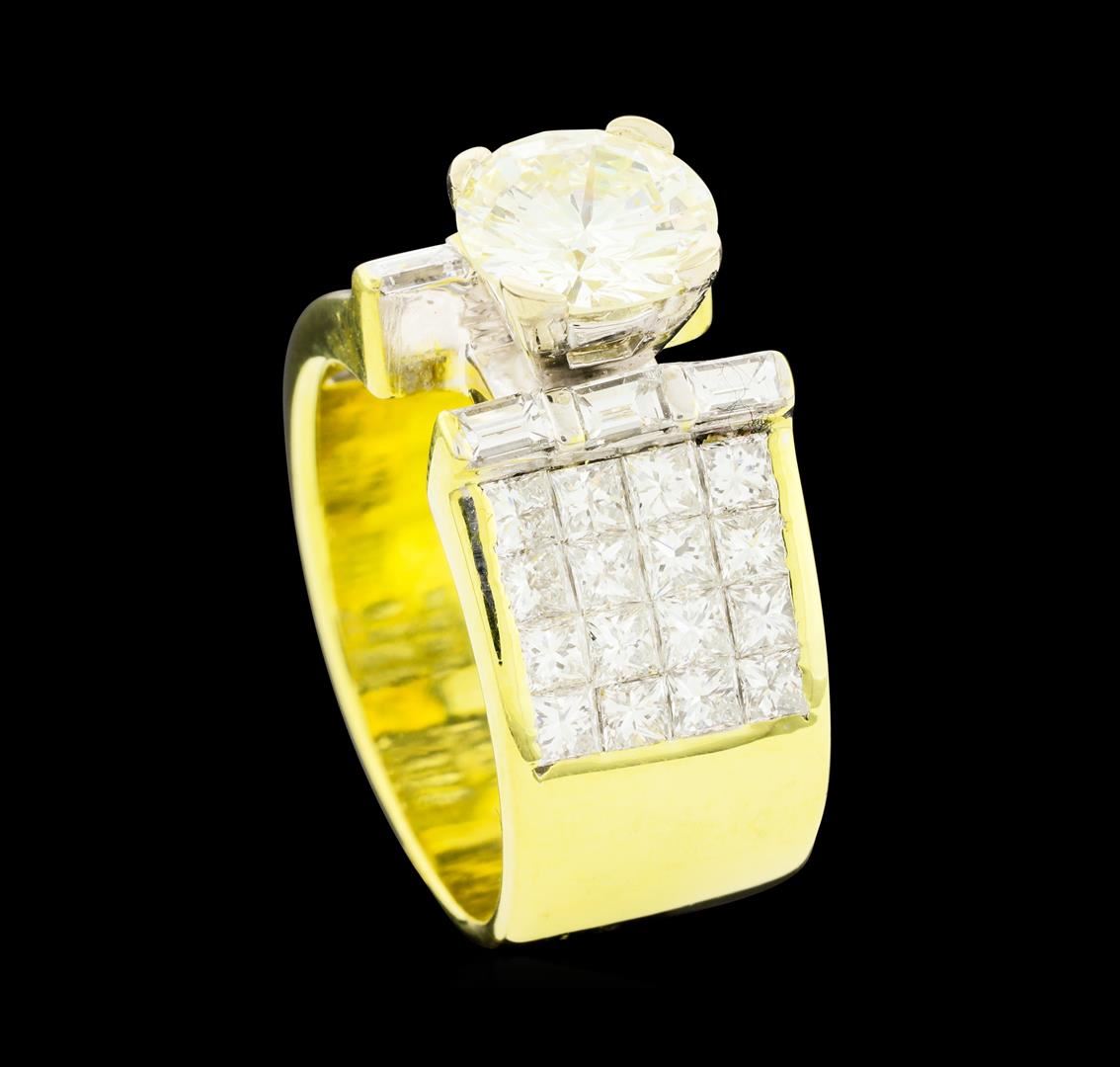 One electronically tested 18KT yellow gold lady's combination cast & assembled wedding ring with a wide band with a bright polish finish. The featured lady's ring has a shank measuring 8.52 millimeters wide. Identified with markings of '18K'. Condition is like new, good workmanship. Containing: One prong set round brilliant cut diamond, measuring 7.55 - 7.52 x 4.53mm (depth est.) approximate weight of 1.57ct. Graded in the setting. Clarity VS-1. Color: J - K Cut Very Good Six channel set baguette cut diamonds, measuring from 2.80 x 1.70 x 1.45mm (depth est.) to 3.00 x 1.90 x 1.62mm (depth est.) approximate total weight of 6 Stones = 0.44ct. Graded in the setting. Clarity VS-1 to VS-2. Color: G - H Cut Very Good Thirty-Two invisible set princess cut diamonds, measuring 2.30 x 2.15 x 1.62mm (depth est.) approximate total weight of 32 Stones = 2.06ct. Graded in the setting. Clarity VS-2 to SI-1. Color: G - H Cut Very Good. Total Weight of Diamonds 4.07ct.. Total Weight of Ring 12.50gm. GAS Appraised at $27,110.00.