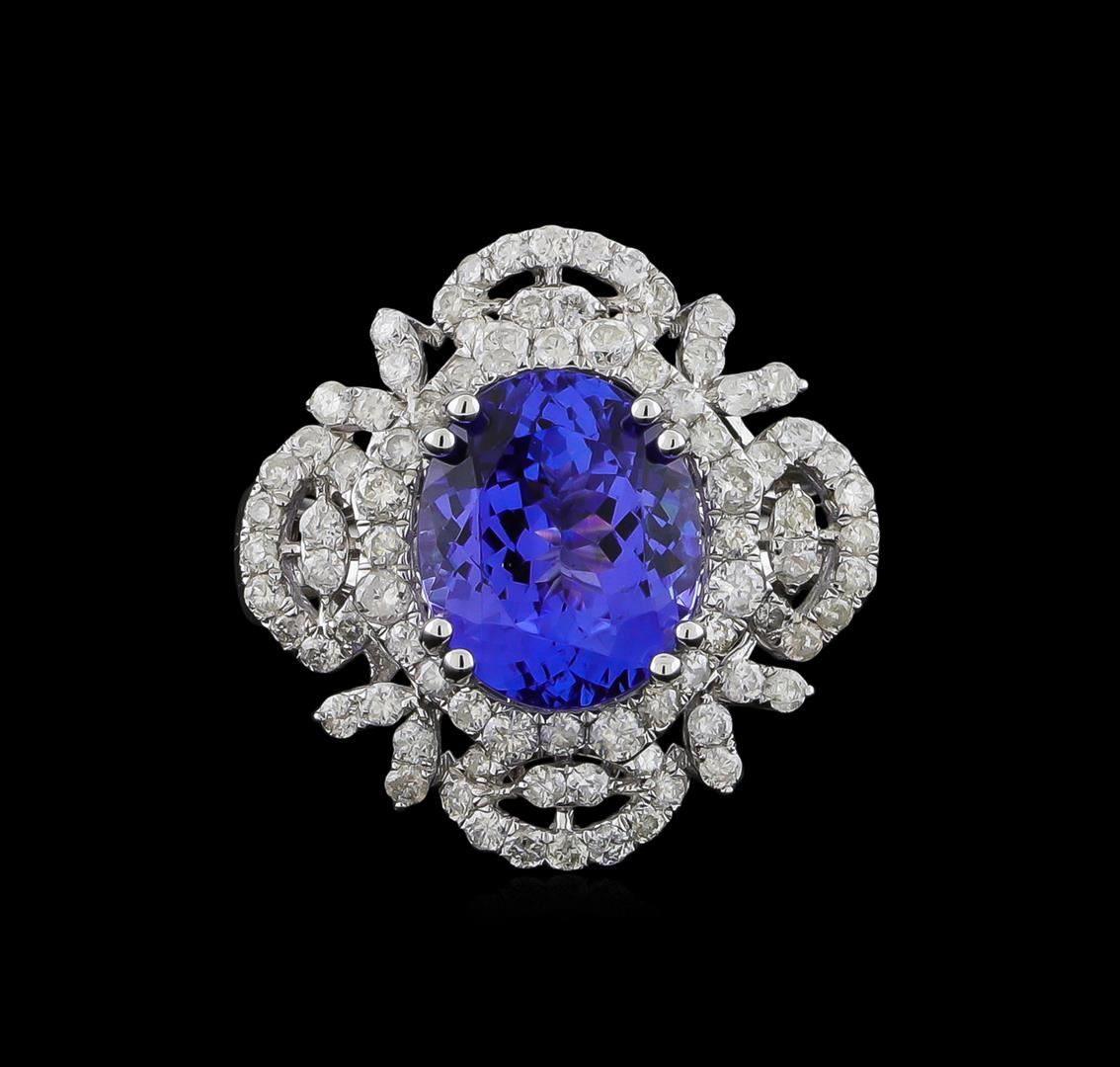 One electronically tested 14KT white gold ladies cast tanzanite and diamond ring with a bright polish finish. The featured tanzanite is set within a stylized diamond set gallery supported by tapering shoulders, completed by a two and one-half millimeter wide band. Trademark is Orianne. Identified with markings of "14K". Condition is new, good workmanship. Containing: One prong set oval mixed cut natural tanzanite, measuring 10.75 x 8.95 x 5.86mm, approximate weight of 4.07ct., clarity is eye clean, type I, medium dark, very slightly grayish, bluish violet color, (GIA bV 6/3), cut is good. Transmitting light with no distortion, transparent. Graded in the setting. Tanzanite is a very rare gemstone that is only found in the country of Tanzania. Originally discovered in 1967. Tiffany & Company, named the stone Tanzanite. It is found in the Usumburu Mountains that border the Umba Valley of northern Tanzania. Tanzanite occurs in gray, brown, violet, blue, reddish-purple, & green. The gem is interesting because of its exceptional pleochroism. Rotated in different directions a tanzanite will exhibit multiple changes of color. Tanzanite has a low tolerance to ultrasonic cleaning, and should not be cleaned using this method. Eighty-Four prong set round brilliant cut diamonds approximate total weight of 84 Stones = 0.99ct. Graded in the setting. Clarity: I-1 to I-2. Color: G - I. Total Weight of Colored Stones 4.07ct. Total Weight of Diamonds 0.99ct. Total Weight of Ring 5.29gm. AIG Appraised at $12,145.00.
