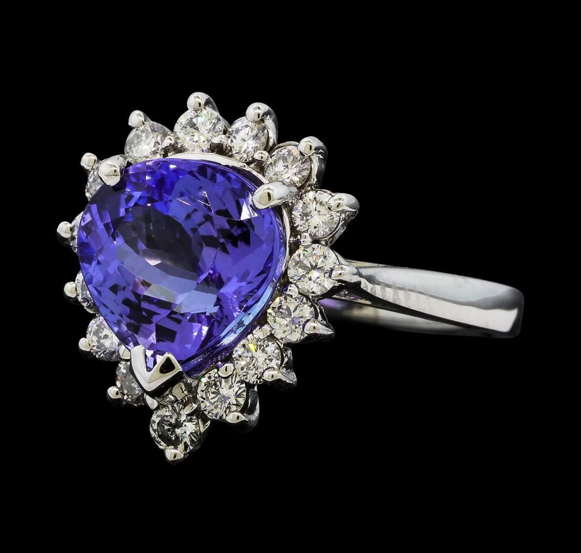 One electronically tested 14KT white gold lady's cast fashion ring with a basket halo with a bright polish finish. The featured lady's ring has a shank measuring 2.20 millimeters wide. Identified with markings of 'K14'. Condition is new, good workmanship. Containing: One prong set pear modified brilliant cut natural tanzanite, measuring 9.98 x 9.67 x 6.60mm, (depth est.) approximate weight of 4.07ct., clarity is eye clean, medium, very slightly grayish, violet color, (GIA V 5/3), cut is very good. Transmitting light with no distortion, transparent. Colored gemstones are presumed to have been subjected to commonly used enhancement processes. Graded in the setting. Fifteen prong set round brilliant cut diamonds, measuring 2.35 - 2.25 x 1.43mm (depth est.) approximate total weight of 15 Stones = 0.70ct. Graded in the setting. Clarity SI-1 to SI-2. Color: H - I Cut Good. Total Weight of Colored Stones 4.07ct.. Total Weight of Diamonds 0.70ct.. Total Weight of Ring 4.90gm. GAS Appraised at $7,755.00.