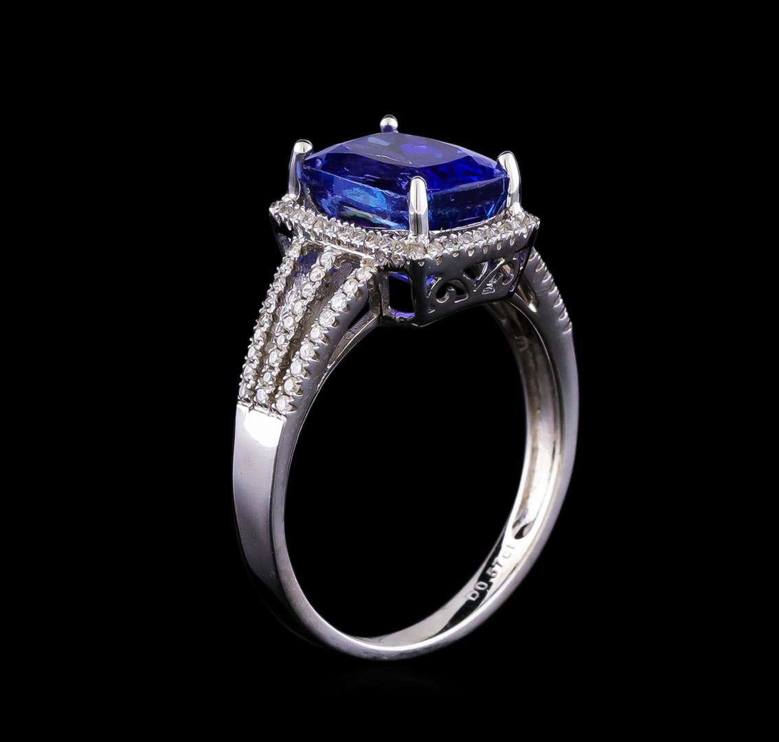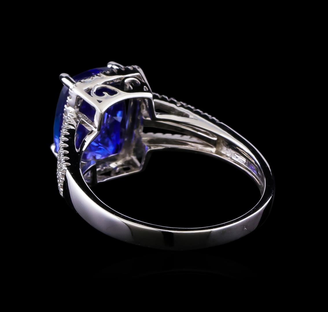 One electronically tested 14KT white gold ladies cast tanzanite and diamond ring with a bright polish finish. The featured tanzanite is set within a diamond bezel supported by diamond set three-way split shoulders, completed by a two millimeter wide band. Trademark is Orianne. Identified with markings of "14K". Condition is new, good workmanship. Containing: One prong set rectangular cushion mixed cut natural tanzanite approximate weight of 4.07ct., clarity is moderately included, type I, medium dark, very slightly grayish, violetish blue color, (GIA vB 6/3), cut is good. Transmitting light with a minimum of distortion, transparent. Naturally occurring internal & external characteristics are present. Graded in the setting. Tanzanite is a very rare gemstone that is only found in the country of Tanzania. Originally discovered in 1967. Tiffany & Company, named the stone Tanzanite. It is found in the Usumburu Mountains that border the Umba Valley of northern Tanzania. Tanzanite occurs in gray, brown, violet, blue, reddish-purple, & green. The gem is interesting because of its exceptional pleochroism. Rotated in different directions a tanzanite will exhibit multiple changes of color. Tanzanite has a low tolerance to ultrasonic cleaning, and should not be cleaned using this method. Ninety-Two prong set round brilliant cut diamonds approximate total weight of 92 Stones = 0.29ct. Graded in the setting. Clarity: I-2 to I-3. Color: H - J. Total Weight of Colored Stones 4.07ct. Total Weight of Diamonds 0.29ct. Total Weight of Ring 3.69gm. AIG Appraised at $10,360.00.