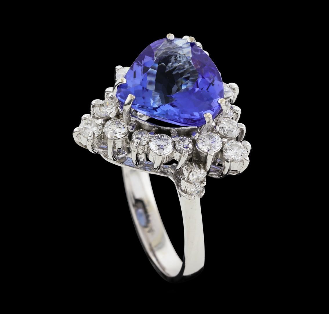 One electronically tested 14KT white gold lady's cast fashion ring with a staggered basket halo with a bright polish finish. The featured lady's ring has a shank measuring 2.67 millimeters wide. Identified with markings of 'K14'. Condition is new, good workmanship. Containing: One prong set pear modified brilliant cut natural tanzanite, measuring 10.90 x 11.60 x 5.46mm, (depth est.) approximate weight of 4.07ct., clarity is eye clean, medium, very slightly grayish, violet color, (GIA V 5/3), cut is good. Transmitting light with no distortion, transparent. Colored gemstones are presumed to have been subjected to commonly used enhancement processes. Graded in the setting. Twelve prong set round brilliant cut diamonds, measuring 2.50 - 2.40 x 1.47mm (depth est.) approximate total weight of 12 Stones = 0.65ct. Graded in the setting. Clarity SI-1 to I-1. Color: G - H Cut Good Ten prong set round brilliant cut diamonds, measuring 1.90 - 1.80 x 1.15mm (depth est.) approximate total weight of 10 Stones = 0.25ct. Graded in the setting. Clarity SI-1 to SI-3. Color: G - H Cut Good. Total Weight of Colored Stones 4.07ct.. Total Weight of Diamonds 0.90ct.. Total Weight of Ring 5.80gm. GAS Appraised at $7,590.00.
