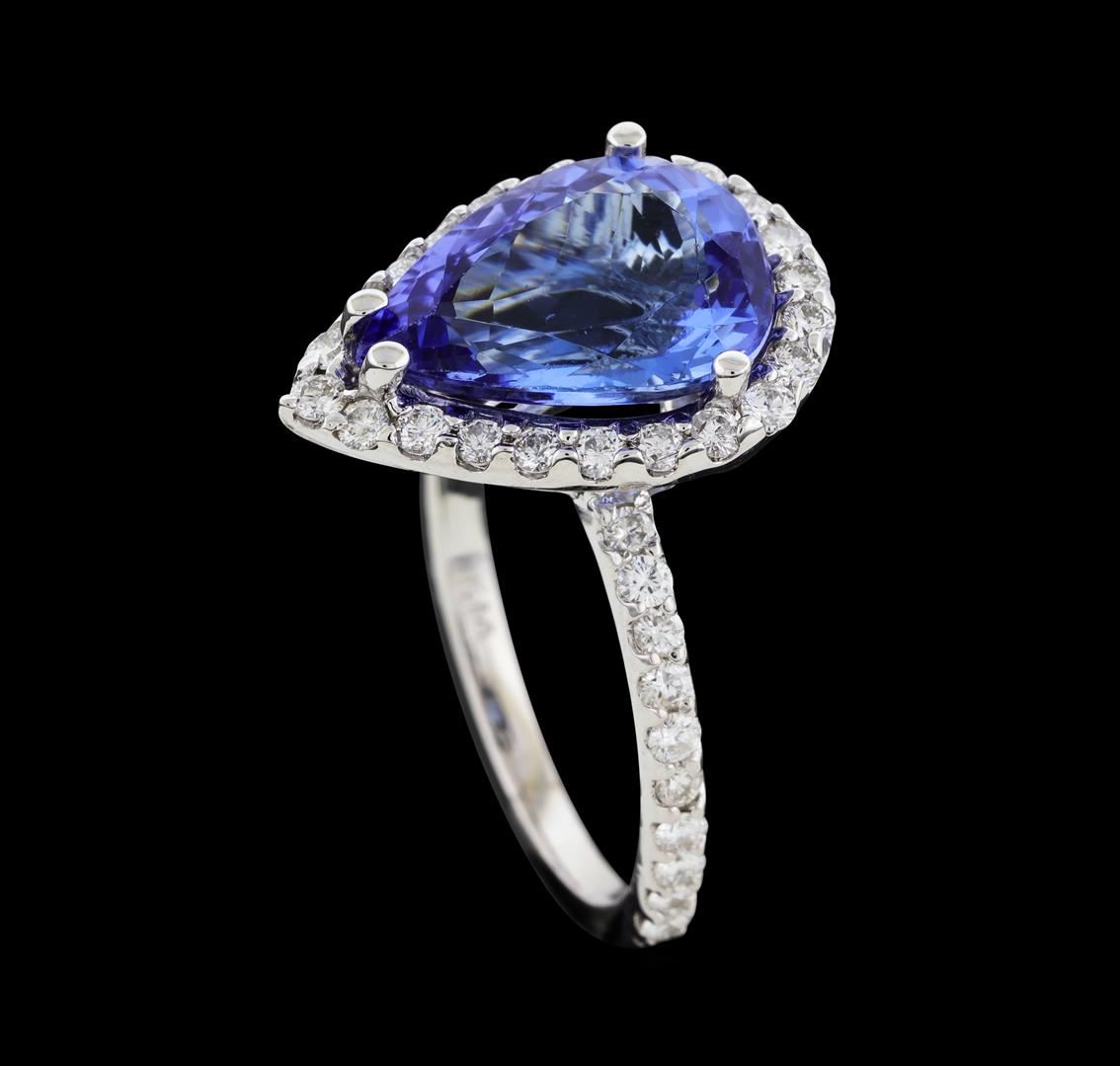 One electronically tested 14KT white gold lady's cast fashion ring with a basket halo with a bright polish finish. The featured lady's ring has a shank measuring 1.74 millimeters wide. Identified with markings of 'K14'. Condition is new, good workmanship. Containing: One prong set pear modified brilliant cut natural tanzanite, measuring 12.80 x 9.00 x 5.76mm, (depth est.) approximate weight of 4.07ct., clarity is eye clean, medium, very slightly grayish, bluish violet color, (GIA bV 5/3), cut is very good. Transmitting light with no distortion, transparent. Colored gemstones are presumed to have been subjected to commonly used enhancement processes. Graded in the setting. Forty-Three prong set round brilliant cut diamonds, measuring 1.70 - 1.60 x 0.99mm (depth est.) approximate total weight of 43 Stones = 0.70ct. Graded in the setting. Clarity SI-1 to SI-3. Color: G - I Cut Good. Total Weight of Colored Stones 4.07ct.. Total Weight of Diamonds 0.70ct.. Total Weight of Ring 4.10gm. GAS Appraised at $8,080.00.
