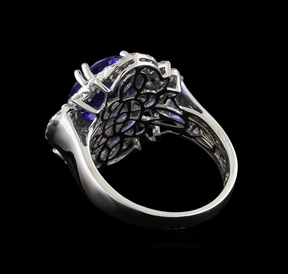 One electronically tested 14KT white gold ladies cast tanzanite and diamond ring with a bright polish finish. The featured tanzanite is set within a stylized diamond set gallery supported by tapering shoulders, completed by a two and one-half millimeter wide band. Trademark is Orianne. Identified with markings of "14K". Condition is new, good workmanship. Containing: One prong set oval mixed cut natural tanzanite, measuring 10.75 x 8.95 x 5.86mm, approximate weight of 4.07ct., clarity is eye clean, type I, medium dark, very slightly grayish, bluish violet color, (GIA bV 6/3), cut is good. Transmitting light with no distortion, transparent. Graded in the setting. Tanzanite is a very rare gemstone that is only found in the country of Tanzania. Originally discovered in 1967. Tiffany & Company, named the stone Tanzanite. It is found in the Usumburu Mountains that border the Umba Valley of northern Tanzania. Tanzanite occurs in gray, brown, violet, blue, reddish-purple, & green. The gem is interesting because of its exceptional pleochroism. Rotated in different directions a tanzanite will exhibit multiple changes of color. Tanzanite has a low tolerance to ultrasonic cleaning, and should not be cleaned using this method. Eighty-Four prong set round brilliant cut diamonds approximate total weight of 84 Stones = 0.99ct. Graded in the setting. Clarity: I-1 to I-2. Color: G - I. Total Weight of Colored Stones 4.07ct. Total Weight of Diamonds 0.99ct. Total Weight of Ring 5.29gm. AIG Appraised.