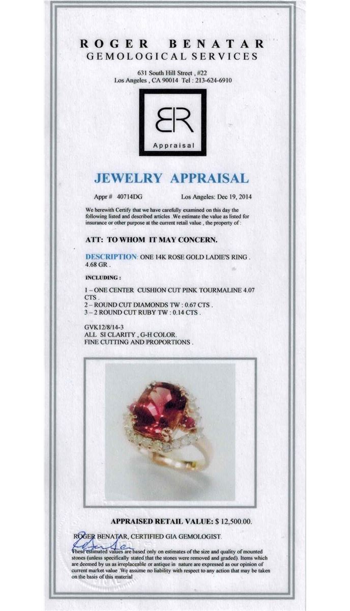 14K ROSE GOLD NATURAL COPPER BEARING PARAIBA TOURMALINE RING:4.68 GRAMS/DIAMOND:0.67CT/RUBY:0.14CT/COPPER BEARING PARAIBA TOURMALINE:4.07CT/#GVR1042