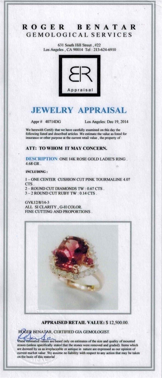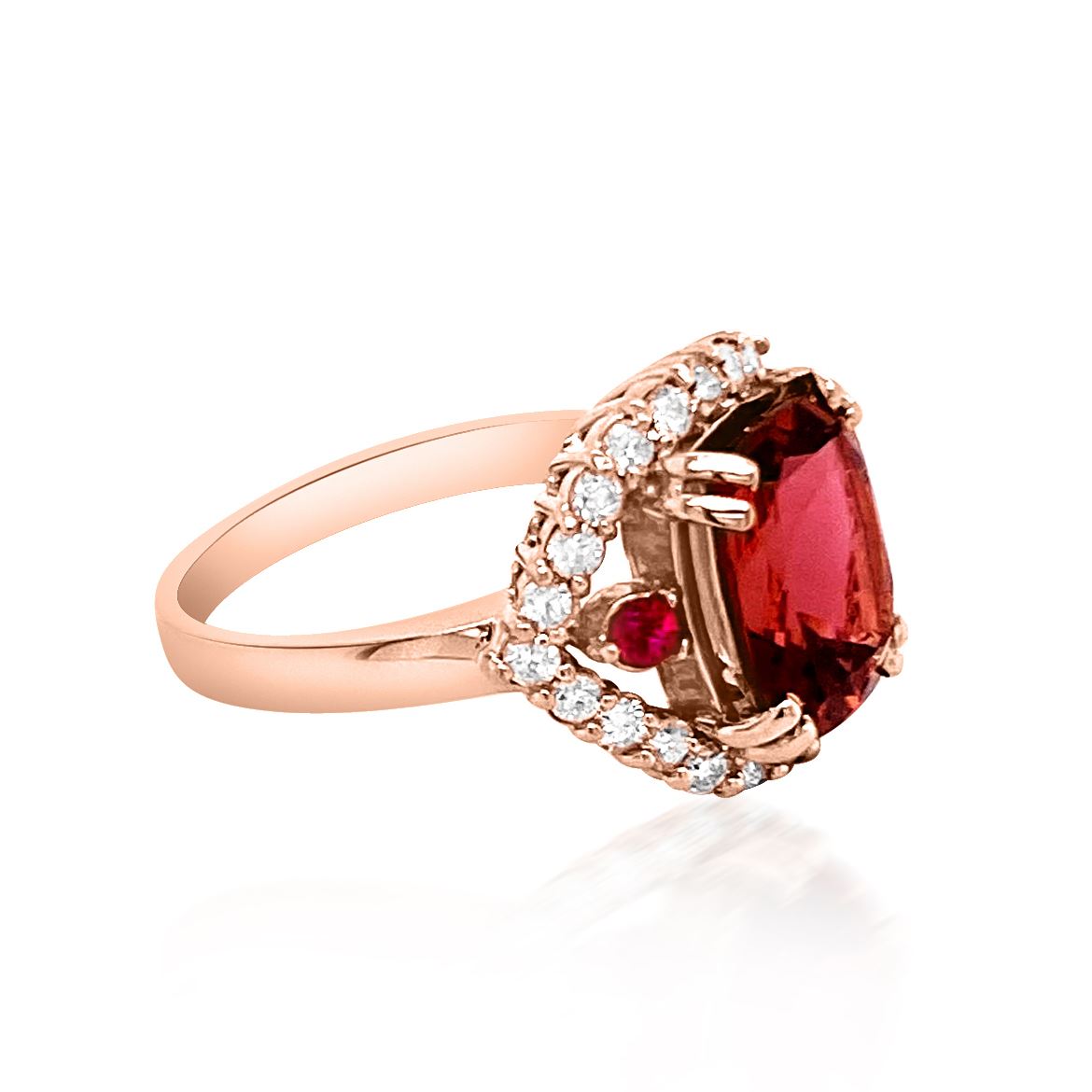 14K ROSE GOLD NATURAL PINK TOURMALINE RING:4.68 GRAMS/DIAMOND:0.67CT/RUBY:0.14CT/PINK TOURMALINE:4.07CT/#GVR1042 **Pink Tourmaline strengthens one's heart and links it to the heart of the Earth. This striking, rare 4.07ct center cushion cut Pink Tourmaline steals the breath with the pure awe of its deep hue. Flanked with 0.14ct round cut Rubies and surrounded by twinkling 0.67ct round cut Diamonds, this cocktail ring is an investment piece, set in a warm 14k rose gold.**
