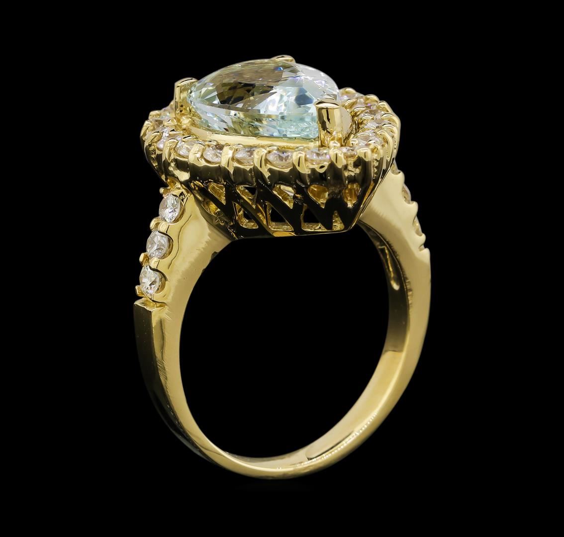 One electronically tested 14KT yellow gold lady's cast fashion ring with a basket halo with a bright polish finish. The featured lady's ring has a shank measuring 2.68 millimeters wide. Identified with markings of 'K14'. Condition is new, good workmanship. Containing: One prong set pear modified brilliant cut natural aquamarine, measuring 13.85 x 9.01 x 6.39mm, (depth est.) approximate weight of 4.08ct., clarity is eye clean, medium light, moderately strong, very slightly greenish blue color, (GIA vslgB 4/4), cut is very good. Transmitting light with no distortion, transparent. Colored gemstones are presumed to have been subjected to commonly used enhancement processes. Graded in the setting. Twenty-Seven prong set round brilliant cut diamonds, measuring 2.20 - 2.15 x 1.35mm (depth est.) approximate total weight of 27 Stones = 1.06ct. Graded in the setting. Clarity SI-1 to I-1. Color: G - H Cut Good. Total Weight of Colored Stones 4.08ct.. Total Weight of Diamonds 1.06ct.. Total Weight of Ring 8.40gm. GAS Appraised at $11,735.00.