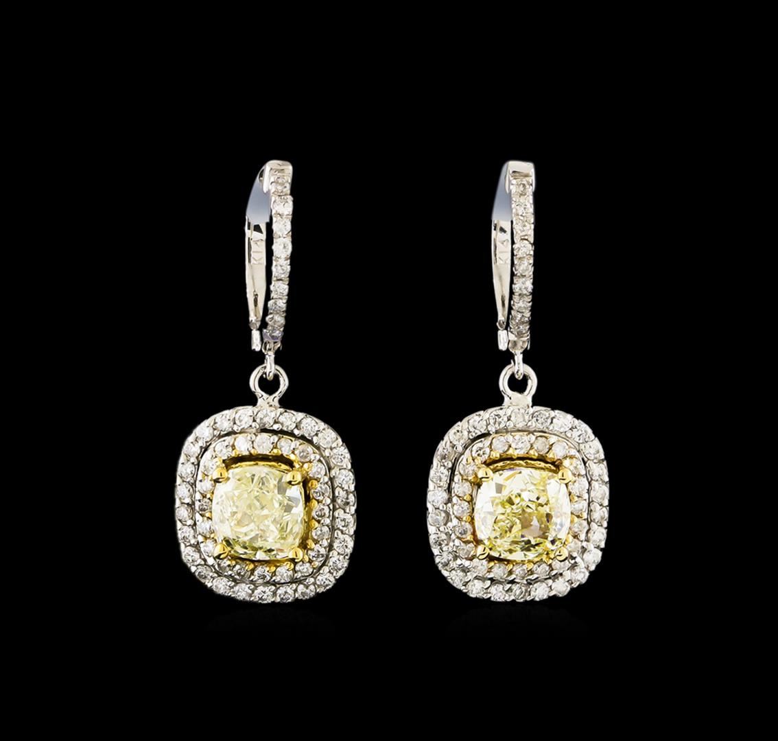 One pair electronically tested 14KT white and yellow gold lady's combination cast & assembled fashion earrings with hinged, snap locking posts with a double cushion halo with a bright polish finish. Identified with markings of "K14". Condition is new, good workmanship. Containing: Two prong set cushion cut diamonds, measuring 6.50 x 6.40 x 4.10mm (depth est.) , 5.00.%. GTCF approximate total weight of 2 Stones = 3.06ct. Graded in the setting. Clarity: VS-2 to SI-1 Cut Very Good Seventy prong set round brilliant cut diamonds, measuring 1.40 - 1.35 x 0.86mm (depth est.) approximate total weight of 70 Stones = 0.70ct. Graded in the setting. Clarity: SI-1 to I-1. Color: G -  Good Forty prong set round brilliant cut diamonds, measuring 1.30 - 1.25 x 0.79mm (depth est.) approximate total weight of 40 Stones = 0.32ct. Graded in the setting. Clarity: SI-1 to I-1. Color: H - I. Cut Good. Total Weight of Diamonds 4.08ct. Total Weight of Earrings 7.40gm. GAS Appraised at $37,260.00.