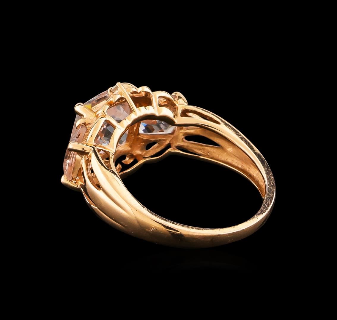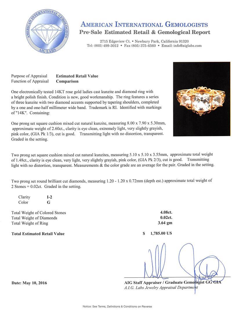 One electronically tested 14KT rose gold ladies cast kunzite and diamond ring with a bright polish finish. The ring features a series of three kunzite with two diamond accents supported by tapering shoulders, completed by a one and one-half millimeter wide band. Trademark is RI. Identified with markings of "14K". Condition is new, good workmanship. Containing: One prong set square cushion mixed cut natural kunzite, measuring 8.00 x 7.90 x 5.30mm, approximate weight of 2.60ct., clarity is eye clean, extremely light, very slightly grayish, pink color, (GIA Pk 1/3), cut is good. Transmitting light with no distortion, transparent. Graded in the setting. Two prong set square cushion mixed cut natural kunzites, measuring 5.10 x 5.10 x 3.55mm, approximate total weight of 1.48ct., clarity is eye clean, very light, very slightly grayish, pink color, (GIA Pk 2/3), cut is good. Transmitting light with no distortion, transparent. Measurements & the color grade are an average for the pair. Graded in the setting. Two prong set round brilliant cut diamonds, measuring 1.20 - 1.20 x 0.72mm (depth est.) approximate total weight of 2 Stones = 0.02ct. Graded in the setting. Clarity: I-2. Color: G. Total Weight of Colored Stones 4.08ct. Total Weight of Diamonds 0.02ct. Total Weight of Ring 3.64gm. AIG Appraised at $1,785.00.