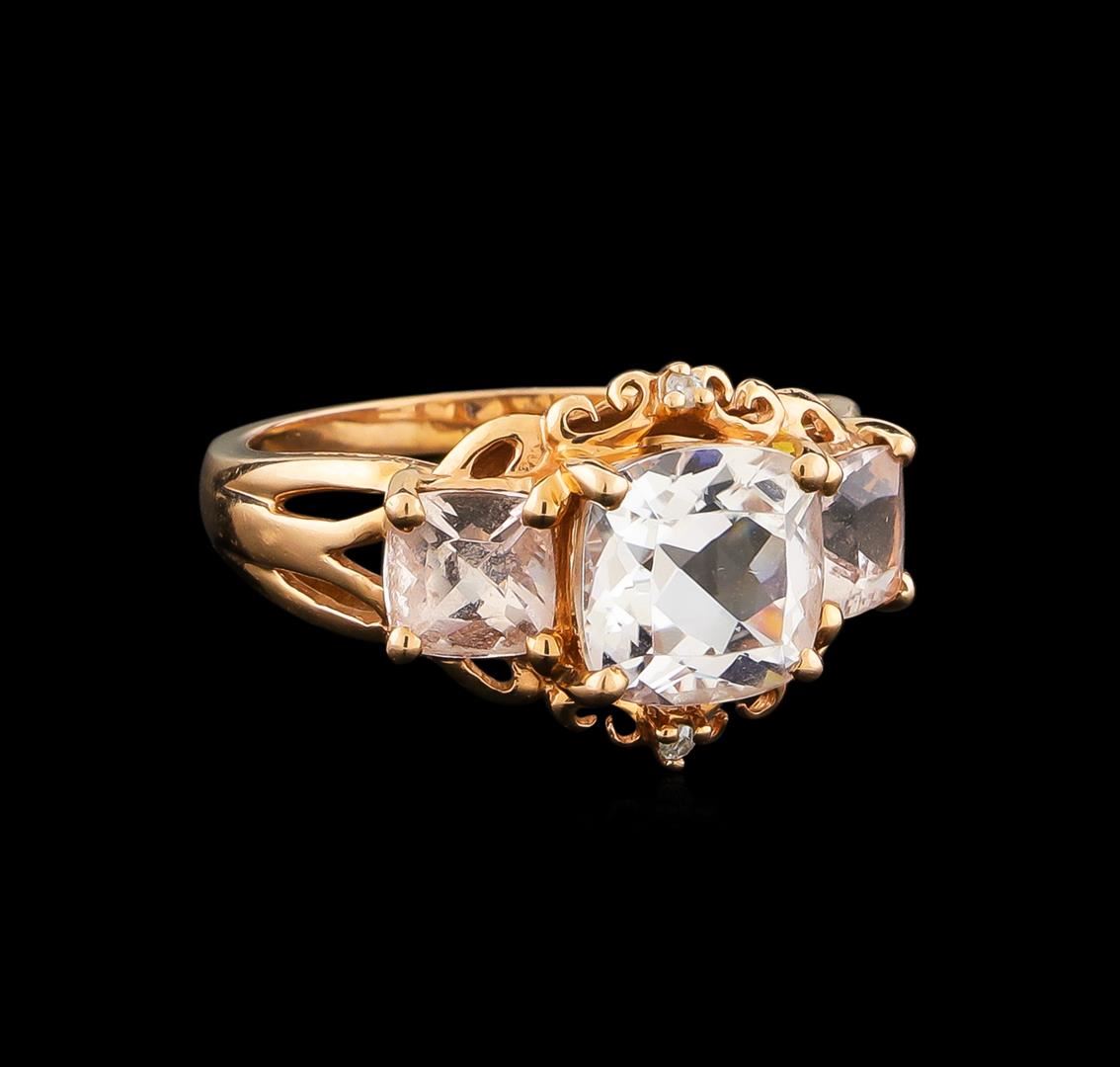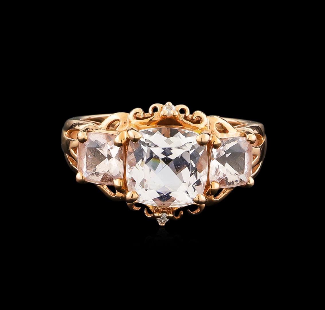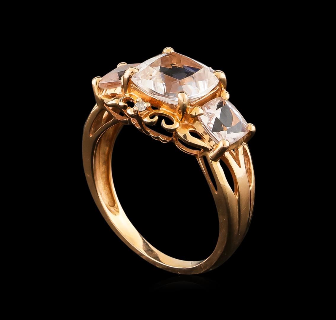 One electronically tested 14KT rose gold ladies cast kunzite and diamond ring with a bright polish finish. The ring features a series of three kunzite with two diamond accents supported by tapering shoulders, completed by a one and one-half millimeter wide band. Trademark is RI. Identified with markings of "14K". Condition is new, good workmanship. Containing: One prong set square cushion mixed cut natural kunzite, measuring 8.00 x 7.90 x 5.30mm, approximate weight of 2.60ct., clarity is eye clean, extremely light, very slightly grayish, pink color, (GIA Pk 1/3), cut is good. Transmitting light with no distortion, transparent. Graded in the setting. Two prong set square cushion mixed cut natural kunzites, measuring 5.10 x 5.10 x 3.55mm, approximate total weight of 1.48ct., clarity is eye clean, very light, very slightly grayish, pink color, (GIA Pk 2/3), cut is good. Transmitting light with no distortion, transparent. Measurements & the color grade are an average for the pair. Graded in the setting. Two prong set round brilliant cut diamonds, measuring 1.20 - 1.20 x 0.72mm (depth est.) approximate total weight of 2 Stones = 0.02ct. Graded in the setting. Clarity: I-2. Color: G. Total Weight of Colored Stones 4.08ct. Total Weight of Diamonds 0.02ct. Total Weight of Ring 3.64gm. AIG Appraised at $1,785.00.