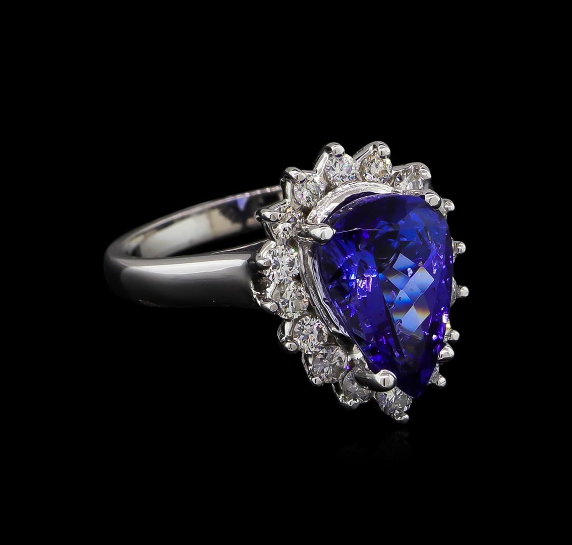 One electronically tested 14KT white gold lady's cast fashion ring with a basket halo with a bright polish finish. The featured lady's ring has a shank measuring 2.30 millimeters wide. Identified with markings of "14K". Condition is new, good workmanship. Containing: One prong set pear modified brilliant cut natural tanzanite, measuring 12.10 x 8.51 x 6.29mm, approximate weight of 4.08ct., clarity is eye clean, type I, medium dark, strong, violetish blue color, (GIA vB 6/5), cut is very good. Transmitting light with no distortion, transparent. Colored gemstones are presumed to have been subjected to commonly used enhancement processes. Graded in the setting. Eleven prong set round brilliant cut diamonds, measuring 2.20 - 2.10 x 1.29mm (depth est.) approximate total weight of 11 Stones = 0.34ct. Graded in the setting. Clarity: SI-1 to SI-2. Color: G - Good Five prong set round brilliant cut diamonds, measuring 1.90 - 1.80 x 1.11mm (depth est.) approximate total weight of 5 Stones = 0.12ct. Graded in the setting. Clarity: VS-2 to SI-2. Color: H - I. Cut Good. Total Weight of Colored Stones 4.08ct. Total Weight of Diamonds 0.46ct. Total Weight of Ring 6.20gm GAS Appraised.
