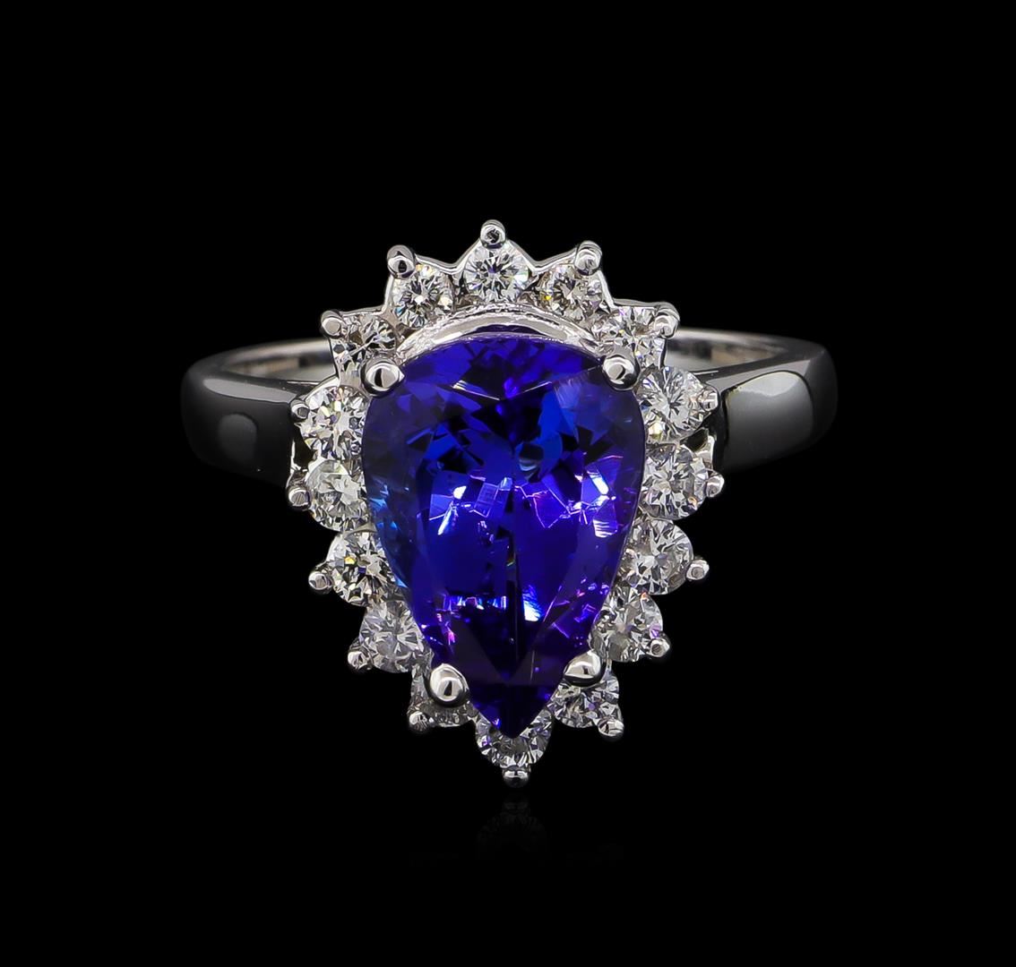 One electronically tested 14KT white gold lady's cast fashion ring with a basket halo with a bright polish finish. The featured lady's ring has a shank measuring 2.30 millimeters wide. Identified with markings of "14K". Condition is new, good workmanship. Containing: One prong set pear modified brilliant cut natural tanzanite, measuring 12.10 x 8.51 x 6.29mm, approximate weight of 4.08ct., clarity is eye clean, type I, medium dark, strong, violetish blue color, (GIA vB 6/5), cut is very good. Transmitting light with no distortion, transparent. Colored gemstones are presumed to have been subjected to commonly used enhancement processes. Graded in the setting. Eleven prong set round brilliant cut diamonds, measuring 2.20 - 2.10 x 1.29mm (depth est.) approximate total weight of 11 Stones = 0.34ct. Graded in the setting. Clarity: SI-1 to SI-2. Color: G - Good Five prong set round brilliant cut diamonds, measuring 1.90 - 1.80 x 1.11mm (depth est.) approximate total weight of 5 Stones = 0.12ct. Graded in the setting. Clarity: VS-2 to SI-2. Color: H - I. Cut Good. Total Weight of Colored Stones 4.08ct. Total Weight of Diamonds 0.46ct. Total Weight of Ring 6.20gm GAS Appraised.