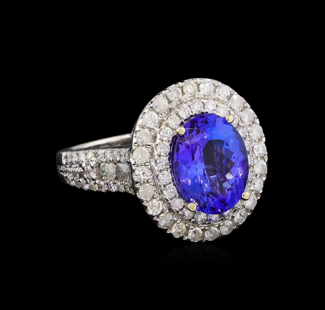 One electronically tested 14KT white gold lady's cast fashion ring with a basket double halo with a bright polish finish. The featured lady's ring has a shank measuring 2.22 millimeters wide. Trademark is Orianne. Identified with markings of "14K". Condition is new, good workmanship. Containing: One prong set oval modified brilliant cut natural tanzanite, measuring 11.20 x 9.00 x 5.75mm, approximate weight of 4.08ct., clarity is eye clean, type I, medium dark, moderately strong, violetish blue color, (GIA vB 6/4), cut is very good. Transmitting light with no distortion, transparent. Colored gemstones are presumed to have been subjected to commonly used enhancement processes. Graded in the setting. Four channel set round brilliant cut diamonds, measuring 2.70 - 2.60 x 1.67mm (depth est.) approximate total weight of 4 Stones = 0.29ct. Graded in the setting. Clarity: I-1 to I-2. Color: G - Good Twenty-Six prong set round brilliant cut diamonds, measuring 1.90 - 1.80 x 1.15mm (depth est.) approximate total weight of 26 Stones = 0.62ct. Graded in the setting. Clarity: I-1 to I-2. Color: G - Good Twenty-Two prong set round brilliant cut diamonds, measuring 1.60 - 1.50 x 0.93mm (depth est.) approximate total weight of 22 Stones = 0.30ct. Graded in the setting. Clarity: SI-2 to I-1. Color: H - I. Cut Good Forty prong set round brilliant cut diamonds, measuring 1.30 - 1.20 x 0.75mm (depth est.) approximate total weight of 40 Stones = 0.28ct. Graded in the setting. Clarity: I-1 to I-2. Color: G - Good. Total Weight of Colored Stones 4.08ct. Total Weight of Diamonds 1.49ct. Total Weight of Ring 8.00gm. GAS Appraised at $11,310.00.