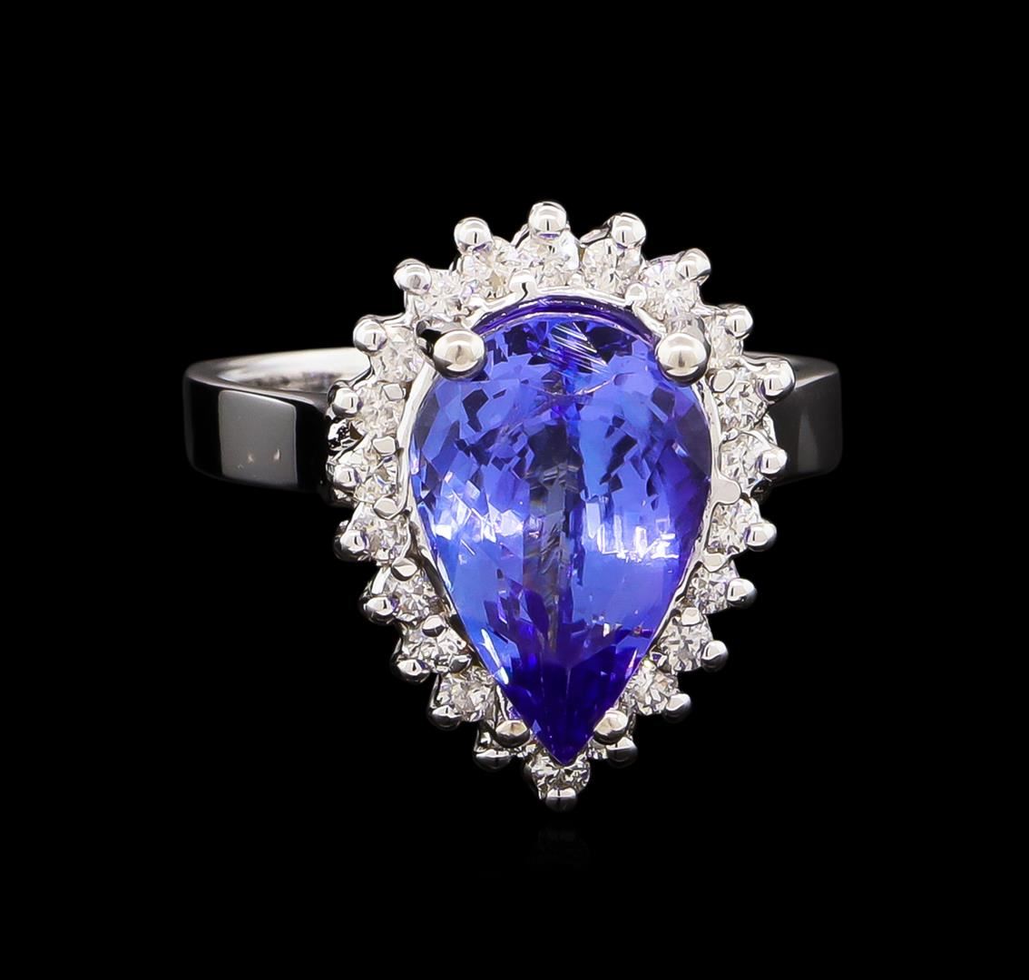 One electronically tested 14KT white gold lady's cast fashion ring with a basket halo with a bright polish finish. The featured lady's ring has a shank measuring 2.80 millimeters wide. Identified with markings of "14K". Condition is new, good workmanship. Containing: One prong set pear modified brilliant cut natural tanzanite, measuring 12.65 x 8.43 x 6.00mm, approximate weight of 4.08ct., clarity is eye clean, type I, medium, moderately strong, violetish blue color, (GIA vB 5/4), cut is very good. Transmitting light with no distortion, transparent. Colored gemstones are presumed to have been subjected to commonly used enhancement processes. Graded in the setting. Twenty-Two prong set round brilliant cut diamonds, measuring 1.70 - 1.65 x 1.04mm (depth est.) approximate total weight of 22 Stones = 0.40ct. Graded in the setting. Clarity: SI-1 to SI-2. Color: H - I. Cut Good. Total Weight of Colored Stones 4.08ct. Total Weight of Diamonds 0.40ct. Total Weight of Ring 6.00gm. GAS Appraised at $8,345.00.