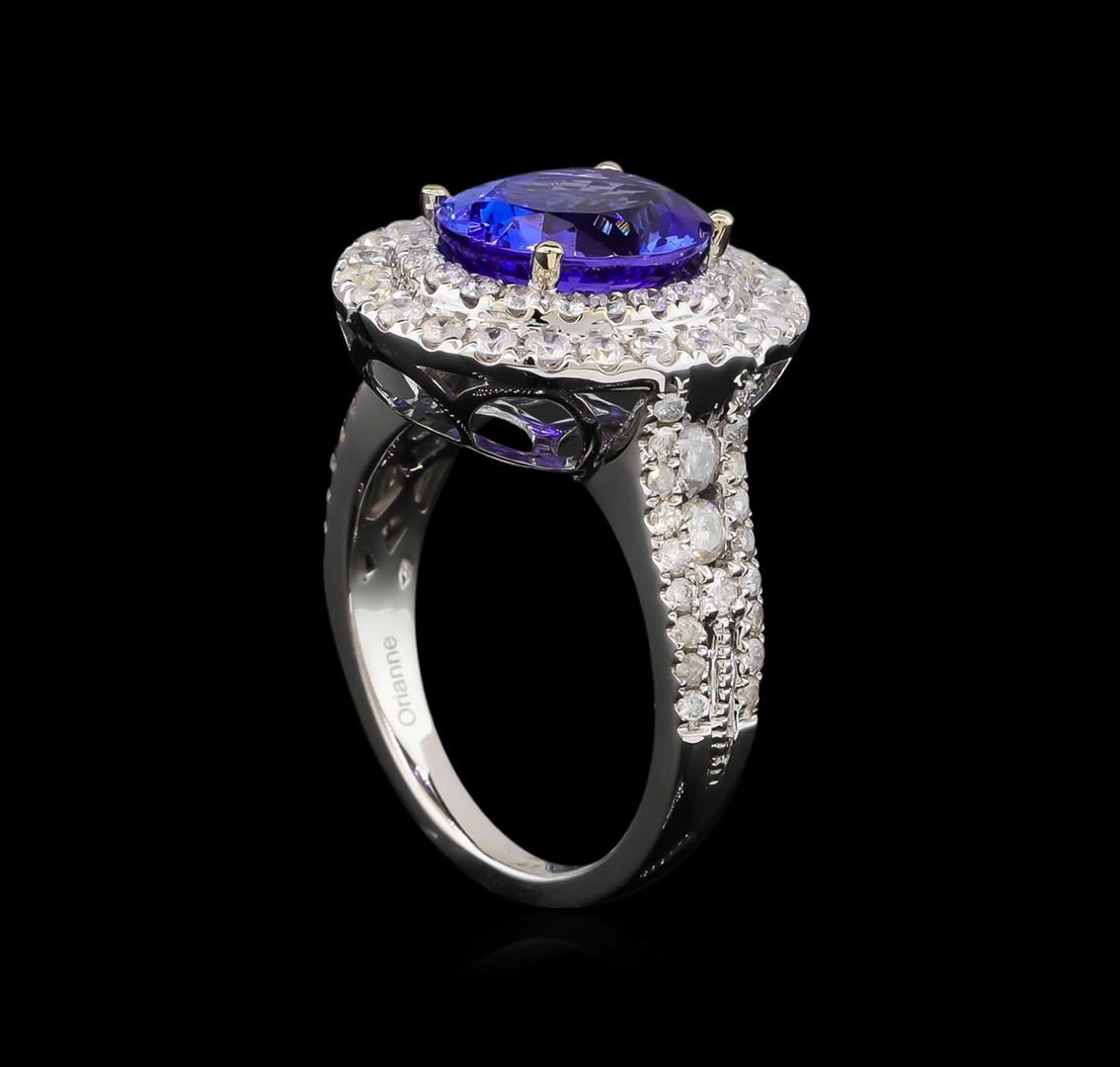 One electronically tested 14KT white gold lady's cast fashion ring with a basket double halo with a bright polish finish. The featured lady's ring has a shank measuring 2.22 millimeters wide. Trademark is Orianne. Identified with markings of "14K". Condition is new, good workmanship. Containing: One prong set oval modified brilliant cut natural tanzanite, measuring 11.20 x 9.00 x 5.75mm, approximate weight of 4.08ct., clarity is eye clean, type I, medium dark, moderately strong, violetish blue color, (GIA vB 6/4), cut is very good. Transmitting light with no distortion, transparent. Colored gemstones are presumed to have been subjected to commonly used enhancement processes. Graded in the setting. Four channel set round brilliant cut diamonds, measuring 2.70 - 2.60 x 1.67mm (depth est.) approximate total weight of 4 Stones = 0.29ct. Graded in the setting. Clarity: I-1 to I-2. Color: G - Good Twenty-Six prong set round brilliant cut diamonds, measuring 1.90 - 1.80 x 1.15mm (depth est.) approximate total weight of 26 Stones = 0.62ct. Graded in the setting. Clarity: I-1 to I-2. Color: G - Good Twenty-Two prong set round brilliant cut diamonds, measuring 1.60 - 1.50 x 0.93mm (depth est.) approximate total weight of 22 Stones = 0.30ct. Graded in the setting. Clarity: SI-2 to I-1. Color: H - I. Cut Good Forty prong set round brilliant cut diamonds, measuring 1.30 - 1.20 x 0.75mm (depth est.) approximate total weight of 40 Stones = 0.28ct. Graded in the setting. Clarity: I-1 to I-2. Color: G - Good. Total Weight of Colored Stones 4.08ct. Total Weight of Diamonds 1.49ct. Total Weight of Ring 8.00gm. GAS Appraised at $11,310.00.
