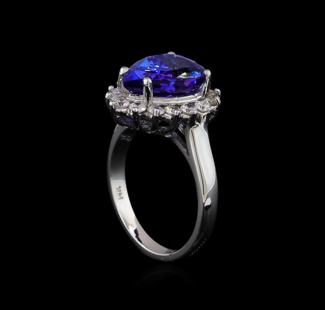 One electronically tested 14KT white gold lady's cast fashion ring with a basket halo with a bright polish finish. The featured lady's ring has a shank measuring 2.30 millimeters wide. Identified with markings of "14K". Condition is new, good workmanship. Containing: One prong set pear modified brilliant cut natural tanzanite, measuring 12.10 x 8.51 x 6.29mm, approximate weight of 4.08ct., clarity is eye clean, type I, medium dark, strong, violetish blue color, (GIA vB 6/5), cut is very good. Transmitting light with no distortion, transparent. Colored gemstones are presumed to have been subjected to commonly used enhancement processes. Graded in the setting. Eleven prong set round brilliant cut diamonds, measuring 2.20 - 2.10 x 1.29mm (depth est.) approximate total weight of 11 Stones = 0.34ct. Graded in the setting. Clarity: SI-1 to SI-2. Color: G - Good Five prong set round brilliant cut diamonds, measuring 1.90 - 1.80 x 1.11mm (depth est.) approximate total weight of 5 Stones = 0.12ct. Graded in the setting. Clarity: VS-2 to SI-2. Color: H - I. Cut Good. Total Weight of Colored Stones 4.08ct. Total Weight of Diamonds 0.46ct. Total Weight of Ring 6.20gm GAS Appraised.