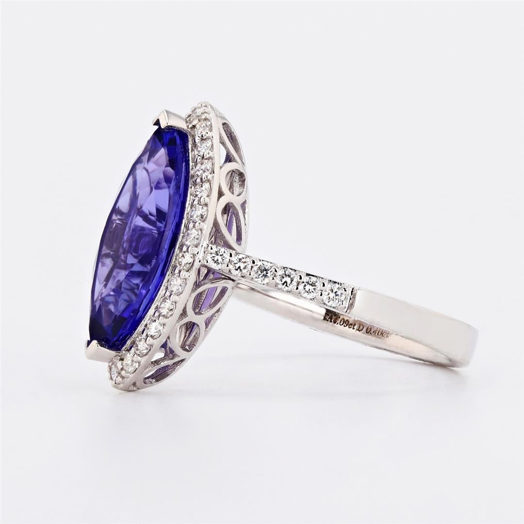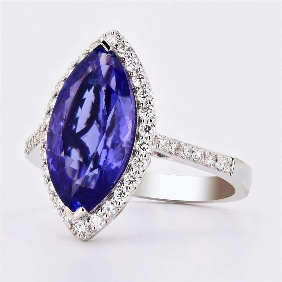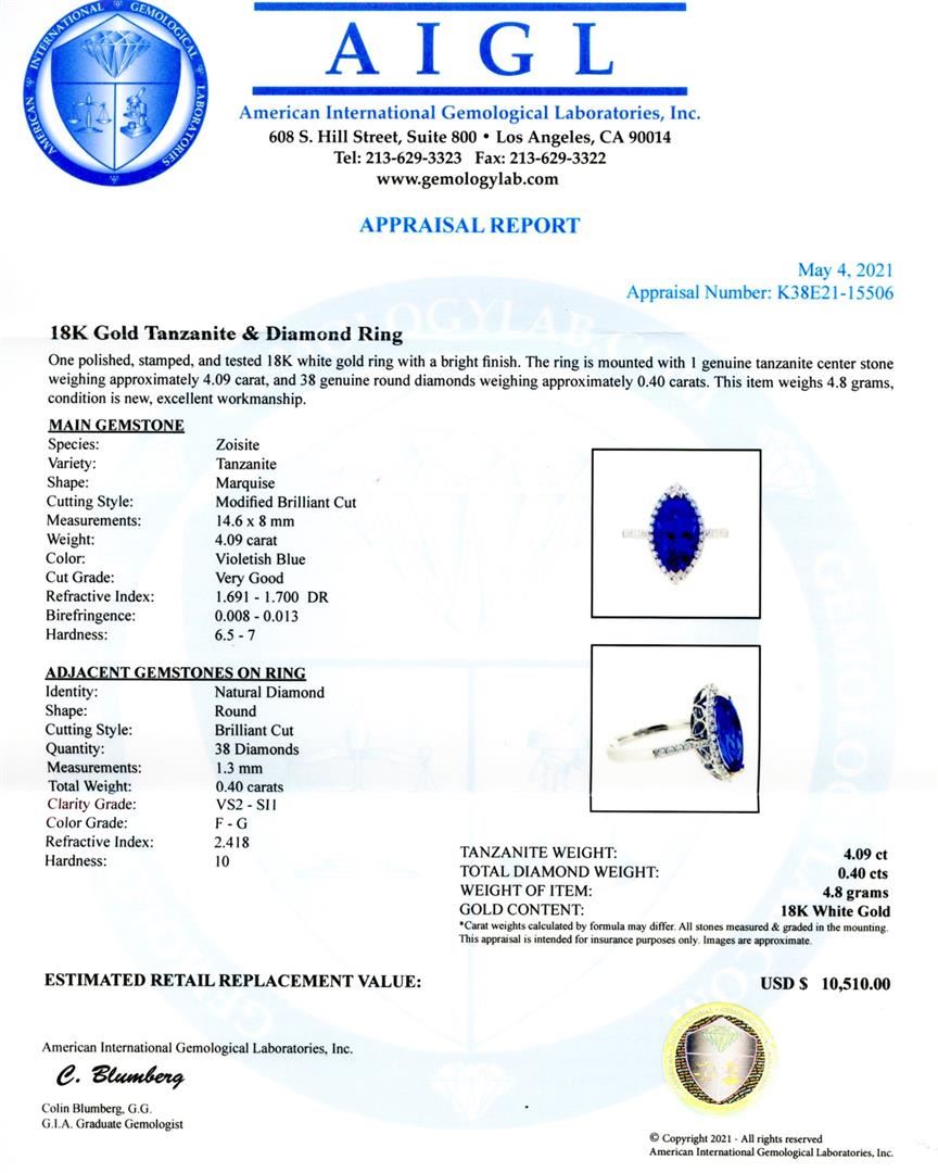 4.09ct Tanzanite and 0.40ctw Diamond 18K White Gold Ring. One polished, stamped, and tested 18K white gold ring with a bright finish. The ring is mounted with 1 genuine tanzanite center stone weighing approximately 4.09 carat, and 38 genuine round diamonds weighing approximately 0.40 carats. This item weighs 4.8 grams, condition is new, excellent workmanship. MAIN GEMSTONE Species: Zoisite Variety: Tanzanite Shape: Marquise Cutting Style: Modified Brilliant Cut Measurements: 14.6 x 8mm Weight: 4.09 carat Color: Violetish Blue Cut Grade: Very Good Refractive Index: 1.691 - 1.700 DR Birefringence: 0.008 - 0.013 Hardness: 6.5 - 7 ADJACENT GEMSTONES ON RING Identity: Natural Diamond Shape: Round Cutting Style: Brilliant Cut Quantity: 38 Diamonds Measurements: 1.3 mm Total Weight: 0.40 carats Clarity Grade: VS2 to SI1 Color Grade: F - G Refractive Index: 2.418 Hardness: 10 TANZANITE WEIGHT: 4.09ct TOTAL DIAMOND WEIGHT: 0.40ctw WEIGHT OF ITEM: 4.8 grams GOLD CONTENT: 18K White Gold
