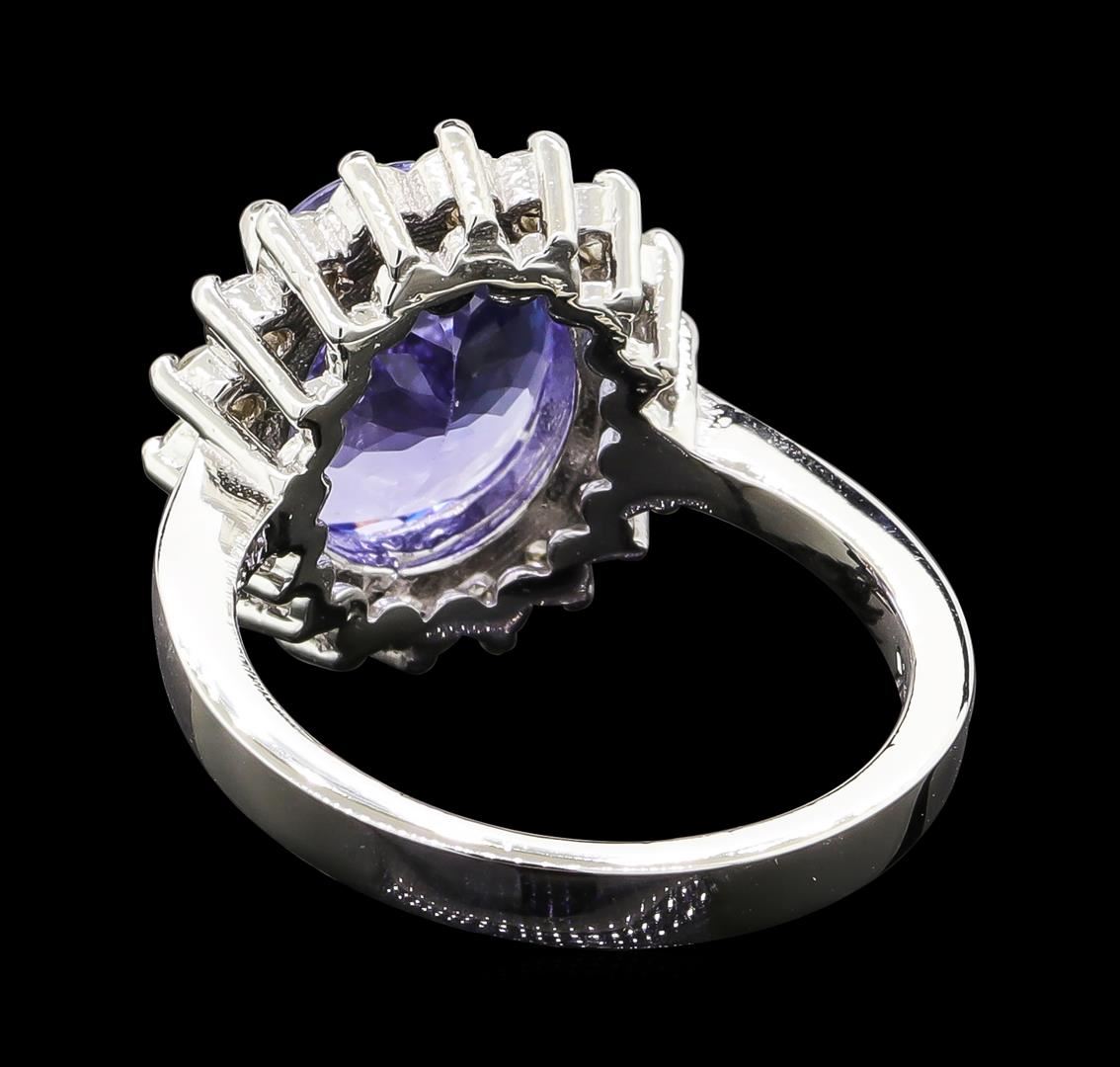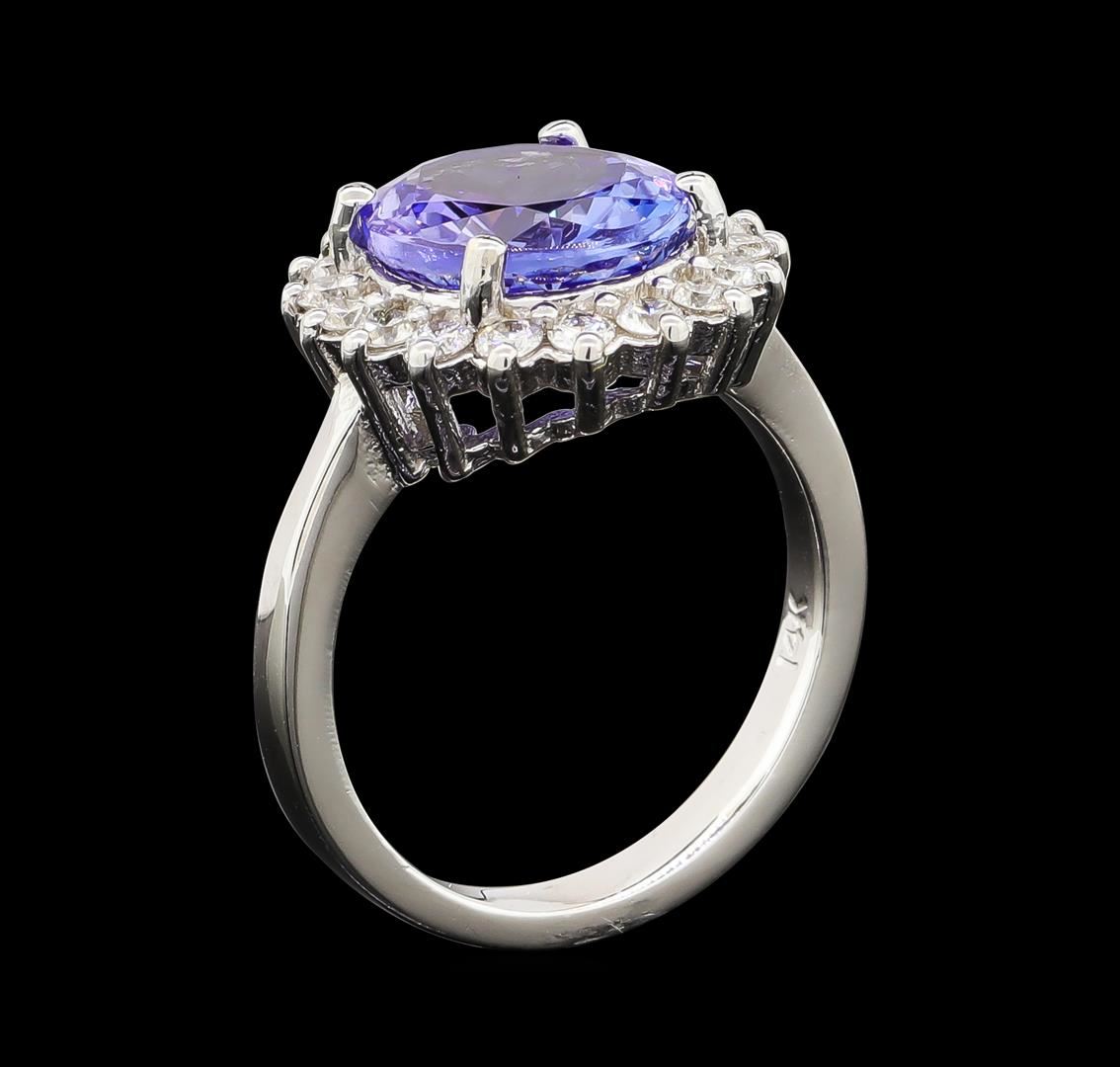 One electronically tested 14KT white gold lady's cast fashion ring with a basket halo with a bright polish finish. The featured lady's ring has a shank measuring 2.73 millimeters wide. Identified with markings of '14K'. Condition is new, good workmanship. Containing: One prong set oval modified brilliant cut natural tanzanite, measuring 11.40 x 9.20 x 5.41mm, (depth est.) approximate weight of 4.09ct., clarity is eye clean, medium light, moderately strong, violet color, (GIA V 4/4), cut is good. Transmitting light with no distortion, transparent. Colored gemstones are presumed to have been subjected to commonly used enhancement processes. Graded in the setting. Eighteen prong set round brilliant cut diamonds, measuring 2.10 - 2.00 x 1.27mm (depth est.) approximate total weight of 18 Stones = 0.60ct. Graded in the setting. Clarity SI-1 to SI-2. Color: H - I Cut Good. Total Weight of Colored Stones 4.09ct.. Total Weight of Diamonds 0.60ct.. Total Weight of Ring 6.20gm. GAS Appraised at $6,965.00.