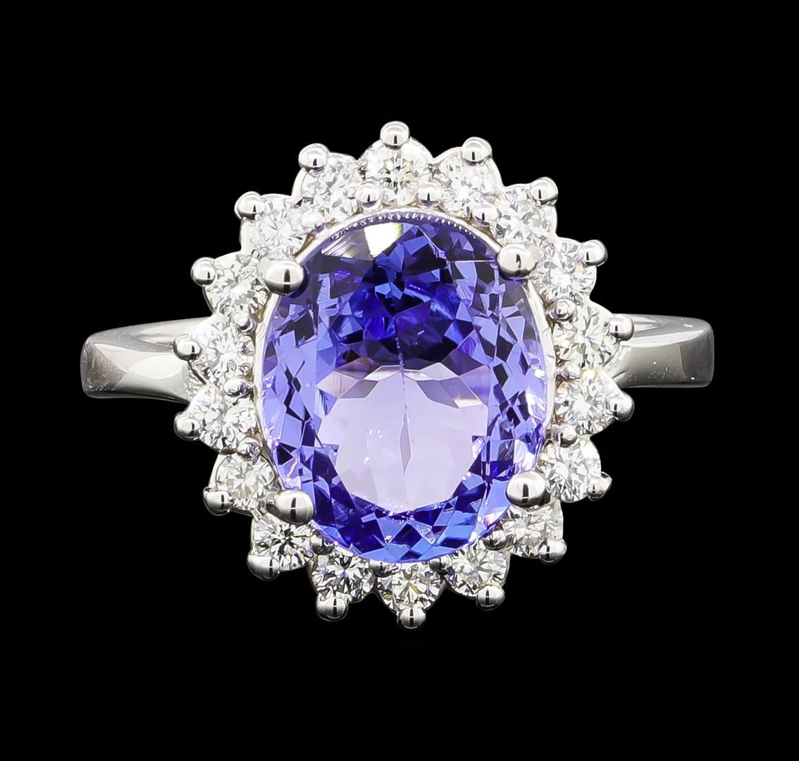 One electronically tested 14KT white gold lady's cast fashion ring with a basket halo with a bright polish finish. The featured lady's ring has a shank measuring 2.73 millimeters wide. Identified with markings of '14K'. Condition is new, good workmanship. Containing: One prong set oval modified brilliant cut natural tanzanite, measuring 11.40 x 9.20 x 5.41mm, (depth est.) approximate weight of 4.09ct., clarity is eye clean, medium light, moderately strong, violet color, (GIA V 4/4), cut is good. Transmitting light with no distortion, transparent. Colored gemstones are presumed to have been subjected to commonly used enhancement processes. Graded in the setting. Eighteen prong set round brilliant cut diamonds, measuring 2.10 - 2.00 x 1.27mm (depth est.) approximate total weight of 18 Stones = 0.60ct. Graded in the setting. Clarity SI-1 to SI-2. Color: H - I Cut Good. Total Weight of Colored Stones 4.09ct.. Total Weight of Diamonds 0.60ct.. Total Weight of Ring 6.20gm. GAS Appraised at $6,965.00.