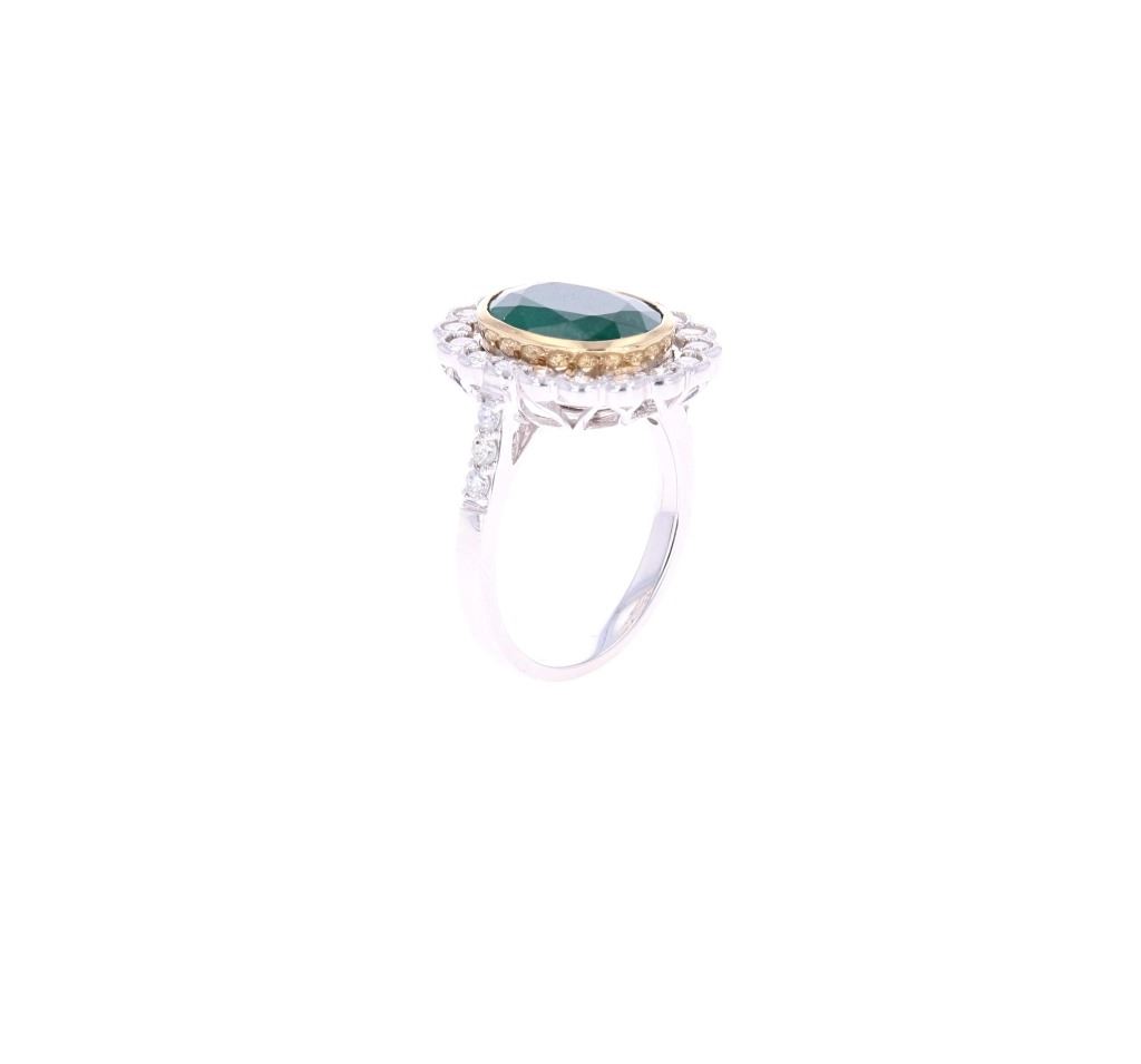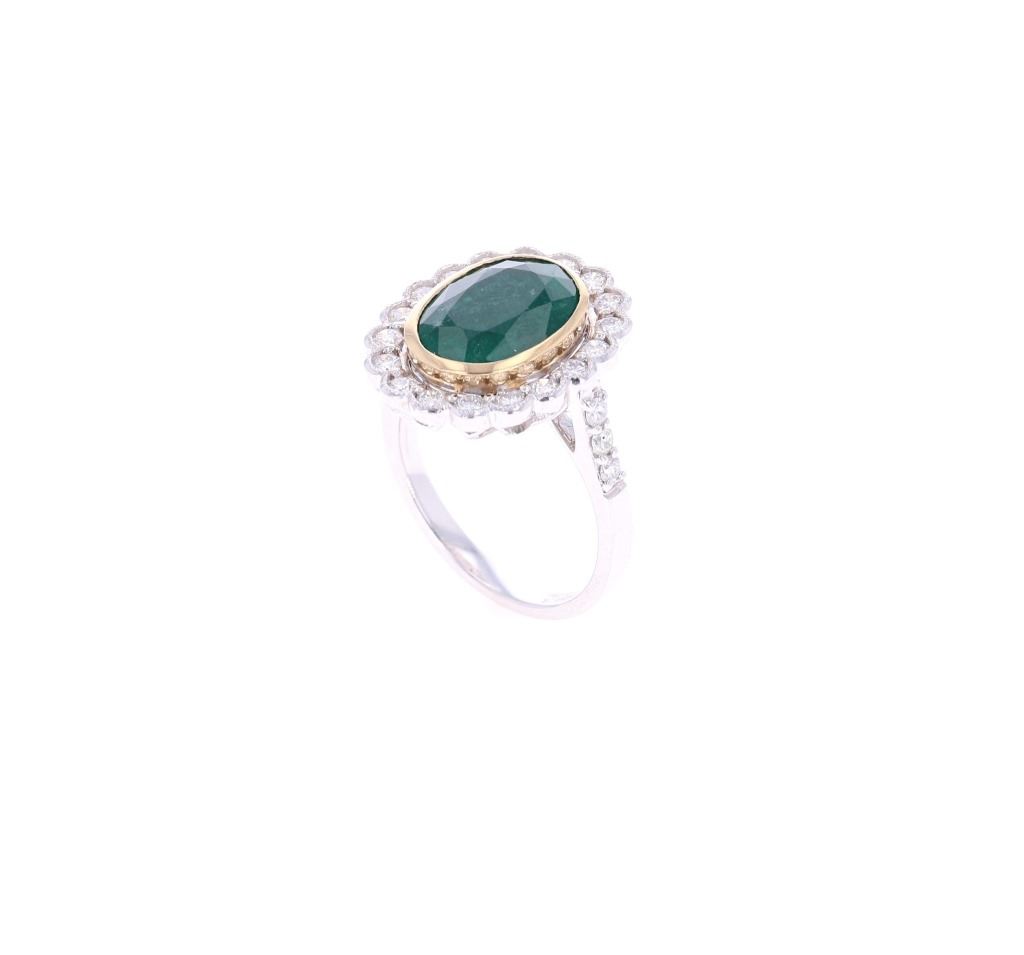 Featured in this lot is this 4.09ct emerald VS diamond and 18k two tone gold ring with GAL paperwork. The ring features a polished, stamped, and tested 18k two tone gold construction that shows the band and face in white gold and mounted for center stone that shows a center stone of oval cut emerald gemstone with measurements of 11.63 x 8.78 x 6.71mm and shows green coloration and moderate saturation with a total weight of 4.09cts. The center stone and shoulders are decorated with a total of 24 round brilliant cut diamonds that shows a clarity of VS - SI with coloration of J - K and a total diamond weight of 1.02cts. The ring size is US 6 1/2. The piece comes complete with GAL(Gemological Appraisal Laboratory of America, Inc., a GIA certified lab GAL Appraisal Number#: GAL202215027) report and appraisal confirming the above info and giving a total value of $17,260.00.